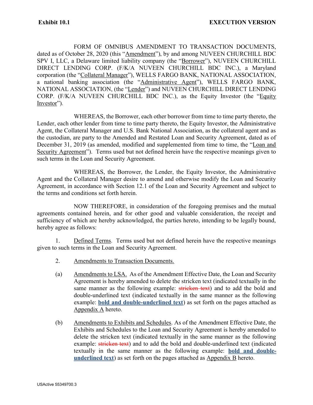 Exhibit 10.1 EXECUTION VERSION FORM OF OMNIBUS AMENDMENT TO TRANSACTION DOCUMENTS, dated as of October 28, 2020 (this “Amendment”), by and among NUVEEN CHURCHILL BDC SPV I, LLC, a Delaware limited liability company (the “Borrower”), NUVEEN CHURCHILL DIRECT LENDING CORP. (F/K/A NUVEEN CHURCHILL BDC INC.), a Maryland corporation (the “Collateral Manager”), WELLS FARGO BANK, NATIONAL ASSOCIATION, a national banking association (the “Administrative Agent”), WELLS FARGO BANK, NATIONAL ASSOCIATION, (the “Lender”) and NUVEEN CHURCHILL DIRECT LENDING CORP. (F/K/A NUVEEN CHURCHILL BDC INC.), as the Equity Investor (the “Equity Investor”). WHEREAS, the Borrower, each other borrower from time to time party thereto, the Lender, each other lender from time to time party thereto, the Equity Investor, the Administrative Agent, the Collateral Manager and U.S. Bank National Association, as the collateral agent and as the custodian, are party to the Amended and Restated Loan and Security Agreement, dated as of December 31, 2019 (as amended, modified and supplemented from time to time, the “Loan and Security Agreement”). Terms used but not defined herein have the respective meanings given to such terms in the Loan and Security Agreement. WHEREAS, the Borrower, the Lender, the Equity Investor, the Administrative Agent and the Collateral Manager desire to amend and otherwise modify the Loan and Security Agreement, in accordance with Section 12.1 of the Loan and Security Agreement and subject to the terms and conditions set forth herein. NOW THEREFORE, in consideration of the foregoing premises and the mutual agreements contained herein, and for other good and valuable consideration, the receipt and sufficiency of which are hereby acknowledged, the parties hereto, intending to be legally bound, hereby agree as follows: Defined Terms. Terms used but not defined herein have the respective meanings given to such terms in the Loan and Security Agreement. Amendments to Transaction Documents. (a) Amendments to LSA. As of the Amendment Effective Date, the Loan and Security Agreement is hereby amended to delete the stricken text (indicated textually in the same manner as the following example: stricken text) and to add the bold and double-underlined text (indicated textually in the same manner as the following example: bold and double-underlined text) as set forth on the pages attached as Appendix A hereto. (b) Amendments to Exhibits and Schedules. As of the Amendment Effective Date, the Exhibits and Schedules to the Loan and Security Agreement is hereby amended to delete the stricken text (indicated textually in the same manner as the following example: stricken text) and to add the bold and double-underlined text (indicated textually in the same manner as the following example: bold and double- underlined text) as set forth on the pages attached as Appendix B hereto. USActive 55349700.3