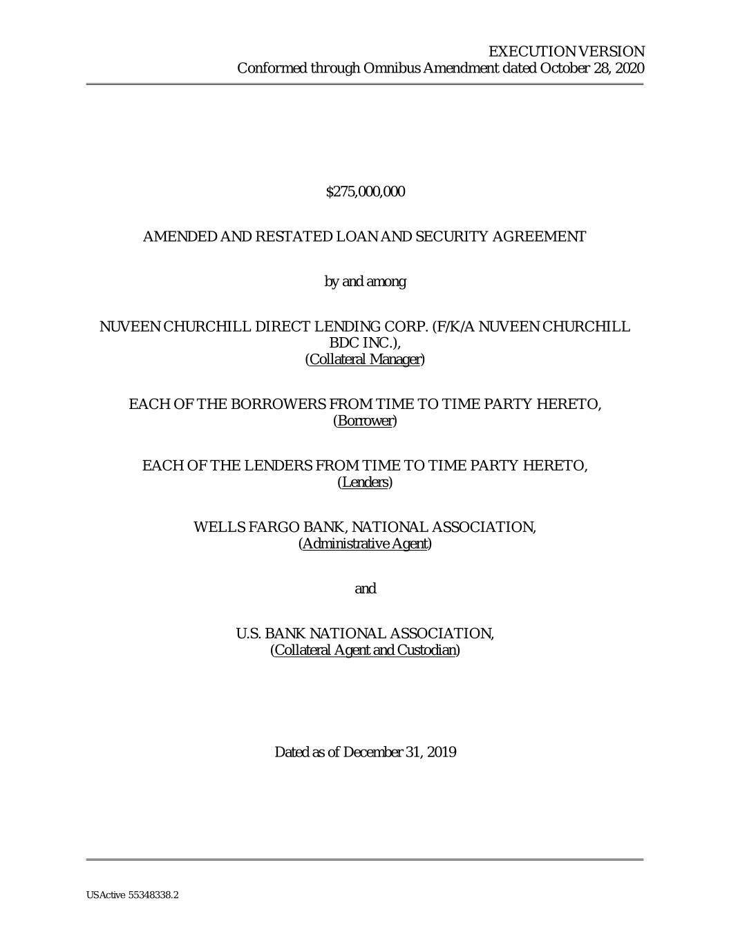 EXECUTION VERSION Conformed through Omnibus Amendment dated October 28, 2020 $275,000,000 AMENDED AND RESTATED LOAN AND SECURITY AGREEMENT by and among NUVEEN CHURCHILL DIRECT LENDING CORP. (F/K/A NUVEEN CHURCHILL BDC INC.), (Collateral Manager) EACH OF THE BORROWERS FROM TIME TO TIME PARTY HERETO, (Borrower) EACH OF THE LENDERS FROM TIME TO TIME PARTY HERETO, (Lenders) WELLS FARGO BANK, NATIONAL ASSOCIATION, (Administrative Agent) and U.S. BANK NATIONAL ASSOCIATION, (Collateral Agent and Custodian) Dated as of December 31, 2019 USActive 55348338.2