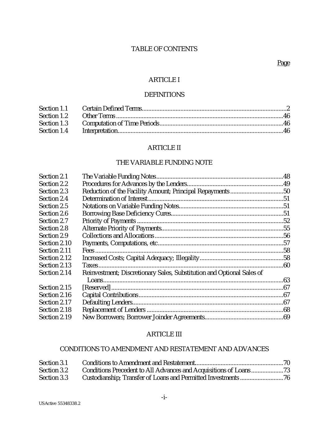TABLE OF CONTENTS Page ARTICLE I DEFINITIONS Section 1.1 Certain Defined Terms ..........................................................................................2 Section 1.2 Other Terms ........................................................................................................46 Section 1.3 Computation of Time Periods .............................................................................46 Section 1.4 Interpretation .......................................................................................................46 ARTICLE II THE VARIABLE FUNDING NOTE Section 2.1 The Variable Funding Notes ...............................................................................48 Section 2.2 Procedures for Advances by the Lenders ............................................................49 Section 2.3 Reduction of the Facility Amount; Principal Repayments .................................50 Section 2.4 Determination of Interest ....................................................................................51 Section 2.5 Notations on Variable Funding Notes.................................................................51 Section 2.6 Borrowing Base Deficiency Cures......................................................................51 Section 2.7 Priority of Payments ...........................................................................................52 Section 2.8 Alternate Priority of Payments............................................................................55 Section 2.9 Collections and Allocations ................................................................................56 Section 2.10 Payments, Computations, etc ..............................................................................57 Section 2.11 Fees .....................................................................................................................58 Section 2.12 Increased Costs; Capital Adequacy; Illegality ....................................................58 Section 2.13 Taxes ...................................................................................................................60 Section 2.14 Reinvestment; Discretionary Sales, Substitution and Optional Sales of Loans ................................................................................................................63 Section 2.15 [Reserved] ...........................................................................................................67 Section 2.16 Capital Contributions ..........................................................................................67 Section 2.17 Defaulting Lenders..............................................................................................67 Section 2.18 Replacement of Lenders .....................................................................................68 Section 2.19 New Borrowers; Borrower Joinder Agreements .................................................69 ARTICLE III CONDITIONS TO AMENDMENT AND RESTATEMENT AND ADVANCES Section 3.1 Conditions to Amendment and Restatement.......................................................70 Section 3.2 Conditions Precedent to All Advances and Acquisitions of Loans ....................73 Section 3.3 Custodianship; Transfer of Loans and Permitted Investments ...........................76 -i- USActive 55348338.2