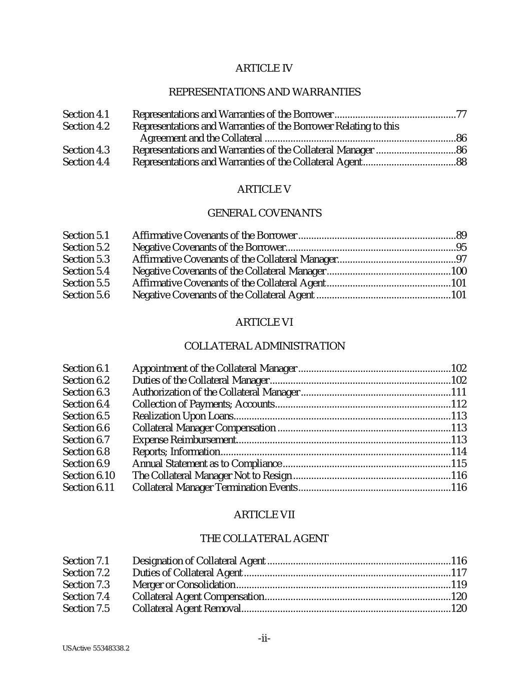 ARTICLE IV REPRESENTATIONS AND WARRANTIES Section 4.1 Representations and Warranties of the Borrower ...............................................77 Section 4.2 Representations and Warranties of the Borrower Relating to this Agreement and the Collateral ..........................................................................86 Section 4.3 Representations and Warranties of the Collateral Manager ...............................86 Section 4.4 Representations and Warranties of the Collateral Agent ....................................88 ARTICLE V GENERAL COVENANTS Section 5.1 Affirmative Covenants of the Borrower .............................................................89 Section 5.2 Negative Covenants of the Borrower ..................................................................95 Section 5.3 Affirmative Covenants of the Collateral Manager ..............................................97 Section 5.4 Negative Covenants of the Collateral Manager ................................................100 Section 5.5 Affirmative Covenants of the Collateral Agent ................................................101 Section 5.6 Negative Covenants of the Collateral Agent ....................................................101 ARTICLE VI COLLATERAL ADMINISTRATION Section 6.1 Appointment of the Collateral Manager ...........................................................102 Section 6.2 Duties of the Collateral Manager ......................................................................102 Section 6.3 Authorization of the Collateral Manager ..........................................................111 Section 6.4 Collection of Payments; Accounts ....................................................................112 Section 6.5 Realization Upon Loans ....................................................................................113 Section 6.6 Collateral Manager Compensation ...................................................................113 Section 6.7 Expense Reimbursement ...................................................................................113 Section 6.8 Reports; Information .........................................................................................114 Section 6.9 Annual Statement as to Compliance .................................................................115 Section 6.10 The Collateral Manager Not to Resign .............................................................116 Section 6.11 Collateral Manager Termination Events ...........................................................116 ARTICLE VII THE COLLATERAL AGENT Section 7.1 Designation of Collateral Agent .......................................................................116 Section 7.2 Duties of Collateral Agent ................................................................................117 Section 7.3 Merger or Consolidation ...................................................................................119 Section 7.4 Collateral Agent Compensation ........................................................................120 Section 7.5 Collateral Agent Removal.................................................................................120 -ii- USActive 55348338.2