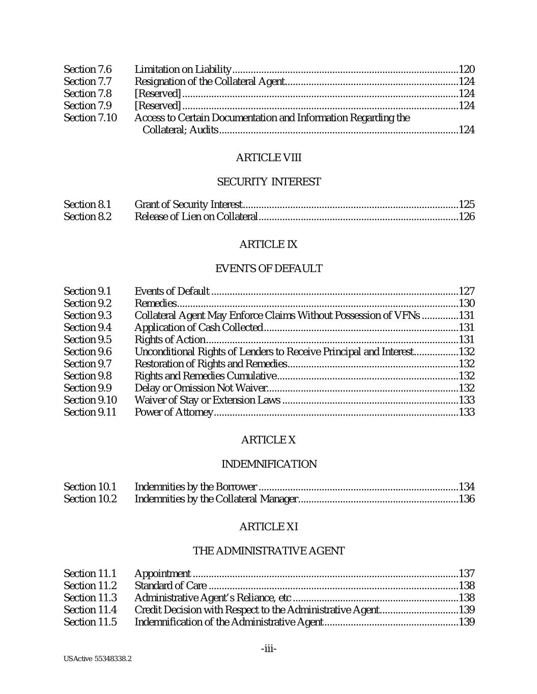 Section 7.6 Limitation on Liability ......................................................................................120 Section 7.7 Resignation of the Collateral Agent ..................................................................124 Section 7.8 [Reserved] .........................................................................................................124 Section 7.9 [Reserved] .........................................................................................................124 Section 7.10 Access to Certain Documentation and Information Regarding the Collateral; Audits ...........................................................................................124 ARTICLE VIII SECURITY INTEREST Section 8.1 Grant of Security Interest ..................................................................................125 Section 8.2 Release of Lien on Collateral ............................................................................126 ARTICLE IX EVENTS OF DEFAULT Section 9.1 Events of Default ..............................................................................................127 Section 9.2 Remedies ...........................................................................................................130 Section 9.3 Collateral Agent May Enforce Claims Without Possession of VFNs ..............131 Section 9.4 Application of Cash Collected ..........................................................................131 Section 9.5 Rights of Action ................................................................................................131 Section 9.6 Unconditional Rights of Lenders to Receive Principal and Interest .................132 Section 9.7 Restoration of Rights and Remedies .................................................................132 Section 9.8 Rights and Remedies Cumulative .....................................................................132 Section 9.9 Delay or Omission Not Waiver.........................................................................132 Section 9.10 Waiver of Stay or Extension Laws ...................................................................133 Section 9.11 Power of Attorney .............................................................................................133 ARTICLE X INDEMNIFICATION Section 10.1 Indemnities by the Borrower ............................................................................134 Section 10.2 Indemnities by the Collateral Manager .............................................................136 ARTICLE XI THE ADMINISTRATIVE AGENT Section 11.1 Appointment .....................................................................................................137 Section 11.2 Standard of Care ...............................................................................................138 Section 11.3 Administrative Agent’s Reliance, etc ...............................................................138 Section 11.4 Credit Decision with Respect to the Administrative Agent ..............................139 Section 11.5 Indemnification of the Administrative Agent ...................................................139 -iii- USActive 55348338.2