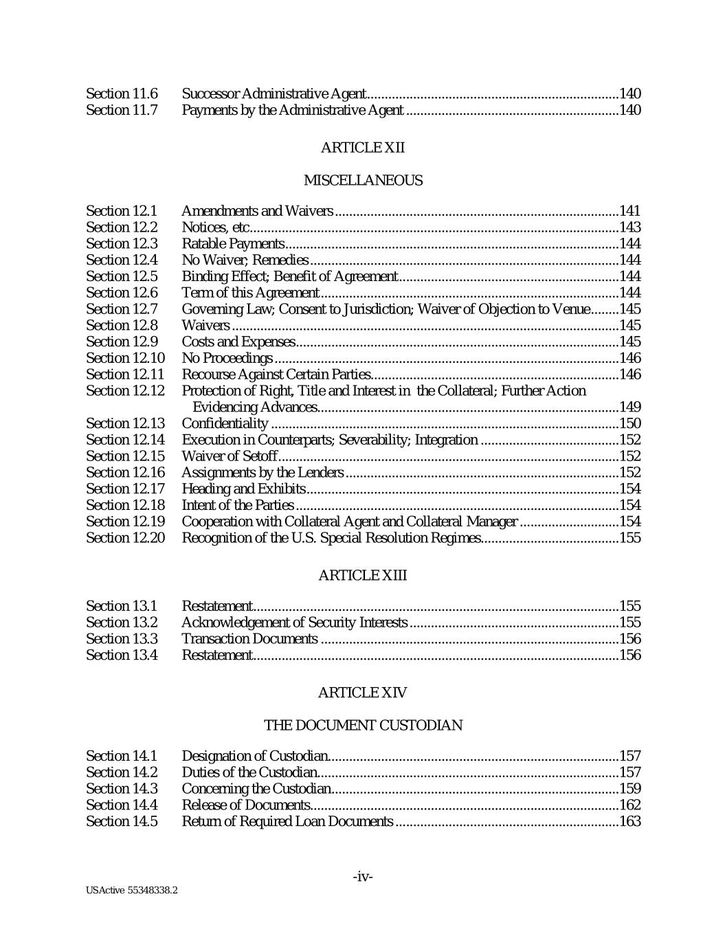 Section 11.6 Successor Administrative Agent .......................................................................140 Section 11.7 Payments by the Administrative Agent ............................................................140 ARTICLE XII MISCELLANEOUS Section 12.1 Amendments and Waivers ................................................................................141 Section 12.2 Notices, etc ........................................................................................................143 Section 12.3 Ratable Payments ..............................................................................................144 Section 12.4 No Waiver; Remedies .......................................................................................144 Section 12.5 Binding Effect; Benefit of Agreement ..............................................................144 Section 12.6 Term of this Agreement ....................................................................................144 Section 12.7 Governing Law; Consent to Jurisdiction; Waiver of Objection to Venue ........145 Section 12.8 Waivers .............................................................................................................145 Section 12.9 Costs and Expenses ...........................................................................................145 Section 12.10 No Proceedings .................................................................................................146 Section 12.11 Recourse Against Certain Parties......................................................................146 Section 12.12 Protection of Right, Title and Interest in the Collateral; Further Action Evidencing Advances.....................................................................................149 Section 12.13 Confidentiality ..................................................................................................150 Section 12.14 Execution in Counterparts; Severability; Integration .......................................152 Section 12.15 Waiver of Setoff ................................................................................................152 Section 12.16 Assignments by the Lenders .............................................................................152 Section 12.17 Heading and Exhibits ........................................................................................154 Section 12.18 Intent of the Parties ...........................................................................................154 Section 12.19 Cooperation with Collateral Agent and Collateral Manager ............................154 Section 12.20 Recognition of the U.S. Special Resolution Regimes.......................................155 ARTICLE XIII Section 13.1 Restatement .......................................................................................................155 Section 13.2 Acknowledgement of Security Interests ...........................................................155 Section 13.3 Transaction Documents ....................................................................................156 Section 13.4 Restatement .......................................................................................................156 ARTICLE XIV THE DOCUMENT CUSTODIAN Section 14.1 Designation of Custodian ..................................................................................157 Section 14.2 Duties of the Custodian .....................................................................................157 Section 14.3 Concerning the Custodian .................................................................................159 Section 14.4 Release of Documents.......................................................................................162 Section 14.5 Return of Required Loan Documents ...............................................................163 -iv- USActive 55348338.2