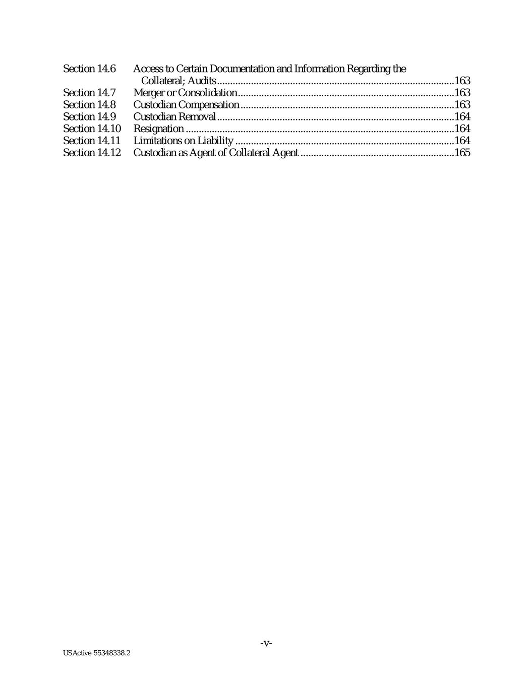 Section 14.6 Access to Certain Documentation and Information Regarding the Collateral; Audits ...........................................................................................163 Section 14.7 Merger or Consolidation ...................................................................................163 Section 14.8 Custodian Compensation ..................................................................................163 Section 14.9 Custodian Removal ...........................................................................................164 Section 14.10 Resignation .......................................................................................................164 Section 14.11 Limitations on Liability ....................................................................................164 Section 14.12 Custodian as Agent of Collateral Agent ...........................................................165 -v- USActive 55348338.2