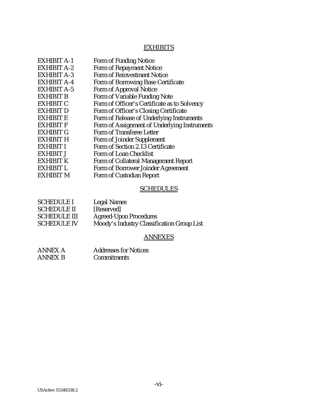 EXHIBITS EXHIBIT A-1 Form of Funding Notice EXHIBIT A-2 Form of Repayment Notice EXHIBIT A-3 Form of Reinvestment Notice EXHIBIT A-4 Form of Borrowing Base Certificate EXHIBIT A-5 Form of Approval Notice EXHIBIT B Form of Variable Funding Note EXHIBIT C Form of Officer’s Certificate as to Solvency EXHIBIT D Form of Officer’s Closing Certificate EXHIBIT E Form of Release of Underlying Instruments EXHIBIT F Form of Assignment of Underlying Instruments EXHIBIT G Form of Transferee Letter EXHIBIT H Form of Joinder Supplement EXHIBIT I Form of Section 2.13 Certificate EXHIBIT J Form of Loan Checklist EXHIBIT K Form of Collateral Management Report EXHIBIT L Form of Borrower Joinder Agreement EXHIBIT M Form of Custodian Report SCHEDULES SCHEDULE I Legal Names SCHEDULE II [Reserved] SCHEDULE III Agreed-Upon Procedures SCHEDULE IV Moody’s Industry Classification Group List ANNEXES ANNEX A Addresses for Notices ANNEX B Commitments -vi- USActive 55348338.2