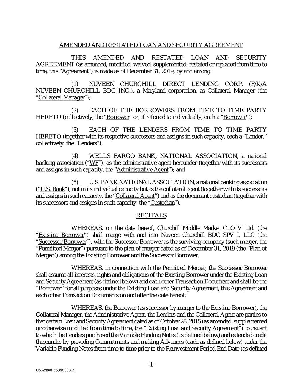 AMENDED AND RESTATED LOAN AND SECURITY AGREEMENT THIS AMENDED AND RESTATED LOAN AND SECURITY AGREEMENT (as amended, modified, waived, supplemented, restated or replaced from time to time, this “Agreement”) is made as of December 31, 2019, by and among: (1) NUVEEN CHURCHILL DIRECT LENDING CORP. (F/K/A NUVEEN CHURCHILL BDC INC.), a Maryland corporation, as Collateral Manager (the “Collateral Manager”); (2) EACH OF THE BORROWERS FROM TIME TO TIME PARTY HERETO (collectively, the “Borrower” or, if referred to individually, each a “Borrower”); (3) EACH OF THE LENDERS FROM TIME TO TIME PARTY HERETO (together with its respective successors and assigns in such capacity, each a “Lender,” collectively, the “Lenders”); (4) WELLS FARGO BANK, NATIONAL ASSOCIATION, a national banking association (“WF”), as the administrative agent hereunder (together with its successors and assigns in such capacity, the “Administrative Agent”); and (5) U.S. BANK NATIONAL ASSOCIATION, a national banking association (“U.S. Bank”), not in its individual capacity but as the collateral agent (together with its successors and assigns in such capacity, the “Collateral Agent”) and as the document custodian (together with its successors and assigns in such capacity, the “Custodian”). RECITALS WHEREAS, on the date hereof, Churchill Middle Market CLO V Ltd. (the “Existing Borrower”) shall merge with and into Nuveen Churchill BDC SPV I, LLC (the “Successor Borrower”), with the Successor Borrower as the surviving company (such merger, the “Permitted Merger”) pursuant to the plan of merger dated as of December 31, 2019 (the “Plan of Merger”) among the Existing Borrower and the Successor Borrower; WHEREAS, in connection with the Permitted Merger, the Successor Borrower shall assume all interests, rights and obligations of the Existing Borrower under the Existing Loan and Security Agreement (as defined below) and each other Transaction Document and shall be the “Borrower” for all purposes under the Existing Loan and Security Agreement, this Agreement and each other Transaction Documents on and after the date hereof; WHEREAS, the Borrower (as successor by merger to the Existing Borrower), the Collateral Manager, the Administrative Agent, the Lenders and the Collateral Agent are parties to that certain Loan and Security Agreement dated as of October 28, 2015 (as amended, supplemented or otherwise modified from time to time, the “Existing Loan and Security Agreement”), pursuant to which the Lenders purchased the Variable Funding Notes (as defined below) and extended credit thereunder by providing Commitments and making Advances (each as defined below) under the Variable Funding Notes from time to time prior to the Reinvestment Period End Date (as defined -1- USActive 55348338.2