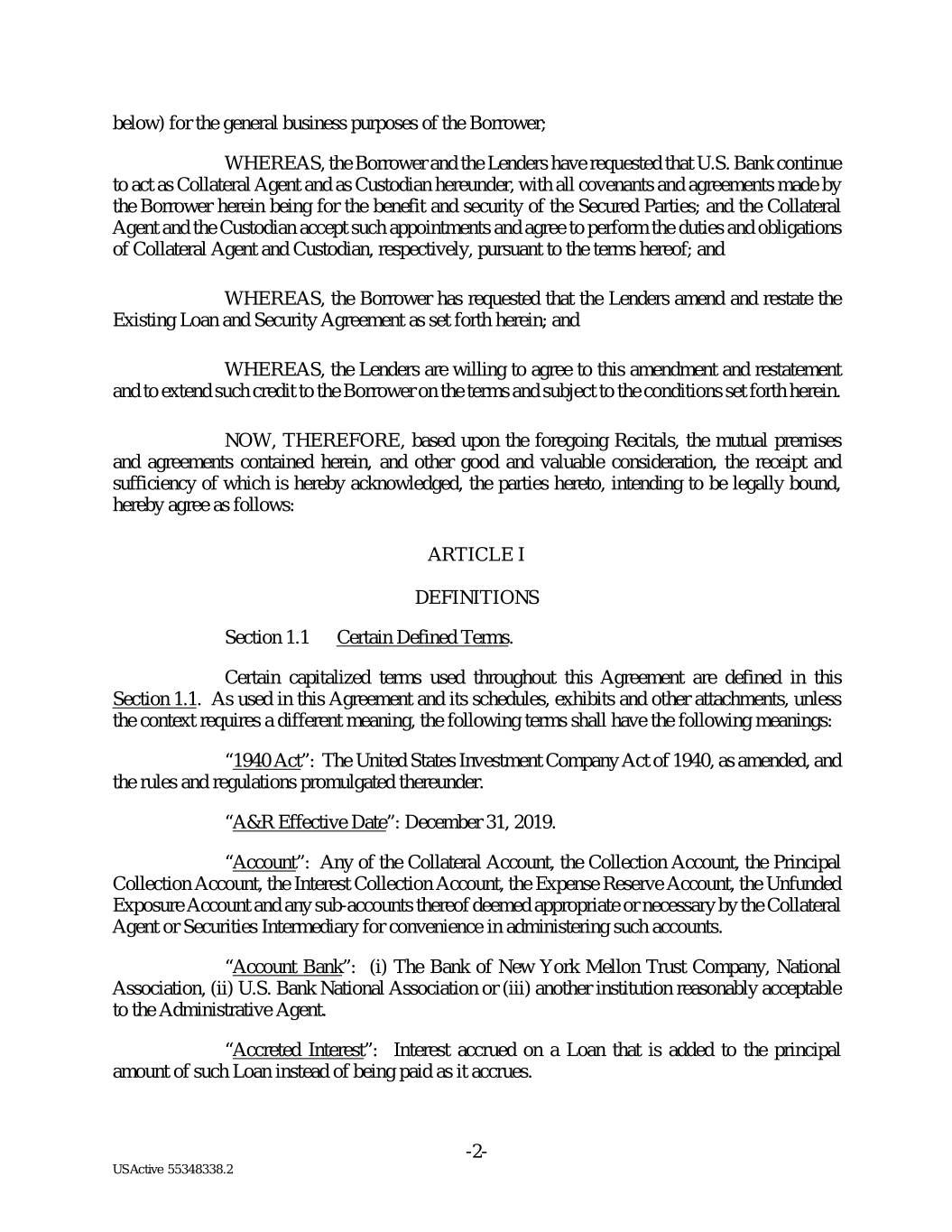 below) for the general business purposes of the Borrower; WHEREAS, the Borrower and the Lenders have requested that U.S. Bank continue to act as Collateral Agent and as Custodian hereunder, with all covenants and agreements made by the Borrower herein being for the benefit and security of the Secured Parties; and the Collateral Agent and the Custodian accept such appointments and agree to perform the duties and obligations of Collateral Agent and Custodian, respectively, pursuant to the terms hereof; and WHEREAS, the Borrower has requested that the Lenders amend and restate the Existing Loan and Security Agreement as set forth herein; and WHEREAS, the Lenders are willing to agree to this amendment and restatement and to extend such credit to the Borrower on the terms and subject to the conditions set forth herein. NOW, THEREFORE, based upon the foregoing Recitals, the mutual premises and agreements contained herein, and other good and valuable consideration, the receipt and sufficiency of which is hereby acknowledged, the parties hereto, intending to be legally bound, hereby agree as follows: ARTICLE I DEFINITIONS Section 1.1 Certain Defined Terms. Certain capitalized terms used throughout this Agreement are defined in this Section 1.1. As used in this Agreement and its schedules, exhibits and other attachments, unless the context requires a different meaning, the following terms shall have the following meanings: “1940 Act”: The United States Investment Company Act of 1940, as amended, and the rules and regulations promulgated thereunder. “A&R Effective Date”: December 31, 2019. “Account”: Any of the Collateral Account, the Collection Account, the Principal Collection Account, the Interest Collection Account, the Expense Reserve Account, the Unfunded Exposure Account and any sub-accounts thereof deemed appropriate or necessary by the Collateral Agent or Securities Intermediary for convenience in administering such accounts. “Account Bank”: (i) The Bank of New York Mellon Trust Company, National Association, (ii) U.S. Bank National Association or (iii) another institution reasonably acceptable to the Administrative Agent. “Accreted Interest”: Interest accrued on a Loan that is added to the principal amount of such Loan instead of being paid as it accrues. -2- USActive 55348338.2