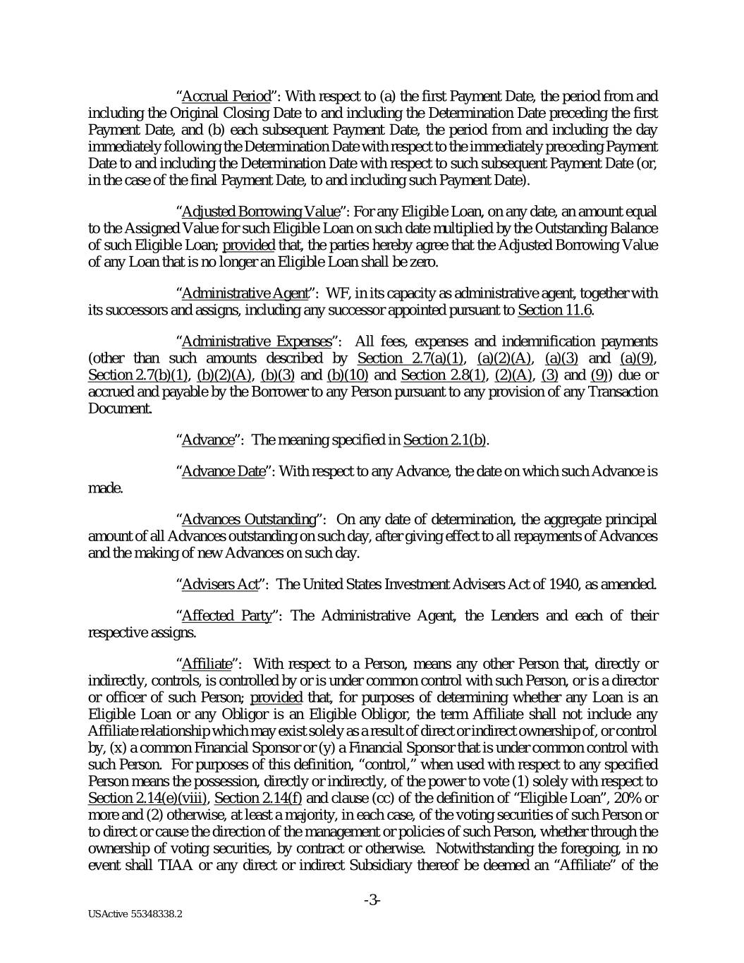 “Accrual Period”: With respect to (a) the first Payment Date, the period from and including the Original Closing Date to and including the Determination Date preceding the first Payment Date, and (b) each subsequent Payment Date, the period from and including the day immediately following the Determination Date with respect to the immediately preceding Payment Date to and including the Determination Date with respect to such subsequent Payment Date (or, in the case of the final Payment Date, to and including such Payment Date). “Adjusted Borrowing Value”: For any Eligible Loan, on any date, an amount equal to the Assigned Value for such Eligible Loan on such date multiplied by the Outstanding Balance of such Eligible Loan; provided that, the parties hereby agree that the Adjusted Borrowing Value of any Loan that is no longer an Eligible Loan shall be zero. “Administrative Agent”: WF, in its capacity as administrative agent, together with its successors and assigns, including any successor appointed pursuant to Section 11.6. “Administrative Expenses”: All fees, expenses and indemnification payments (other than such amounts described by Section 2.7(a)(1), (a)(2)(A), (a)(3) and (a)(9), Section 2.7(b)(1), (b)(2)(A), (b)(3) and (b)(10) and Section 2.8(1), (2)(A), (3) and (9)) due or accrued and payable by the Borrower to any Person pursuant to any provision of any Transaction Document. “Advance”: The meaning specified in Section 2.1(b). “Advance Date”: With respect to any Advance, the date on which such Advance is made. “Advances Outstanding”: On any date of determination, the aggregate principal amount of all Advances outstanding on such day, after giving effect to all repayments of Advances and the making of new Advances on such day. “Advisers Act”: The United States Investment Advisers Act of 1940, as amended. “Affected Party”: The Administrative Agent, the Lenders and each of their respective assigns. “Affiliate”: With respect to a Person, means any other Person that, directly or indirectly, controls, is controlled by or is under common control with such Person, or is a director or officer of such Person; provided that, for purposes of determining whether any Loan is an Eligible Loan or any Obligor is an Eligible Obligor, the term Affiliate shall not include any Affiliate relationship which may exist solely as a result of direct or indirect ownership of, or control by, (x) a common Financial Sponsor or (y) a Financial Sponsor that is under common control with such Person. For purposes of this definition, “control,” when used with respect to any specified Person means the possession, directly or indirectly, of the power to vote (1) solely with respect to Section 2.14(e)(viii), Section 2.14(f) and clause (cc) of the definition of “Eligible Loan”, 20% or more and (2) otherwise, at least a majority, in each case, of the voting securities of such Person or to direct or cause the direction of the management or policies of such Person, whether through the ownership of voting securities, by contract or otherwise. Notwithstanding the foregoing, in no event shall TIAA or any direct or indirect Subsidiary thereof be deemed an “Affiliate” of the -3- USActive 55348338.2