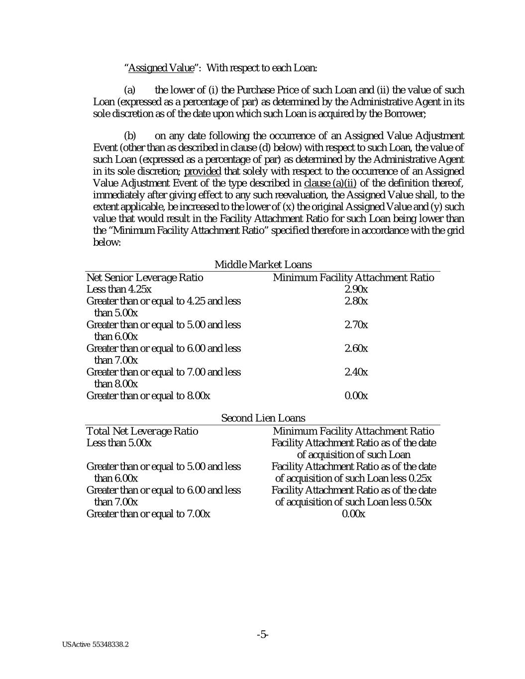“Assigned Value”: With respect to each Loan: (a) the lower of (i) the Purchase Price of such Loan and (ii) the value of such Loan (expressed as a percentage of par) as determined by the Administrative Agent in its sole discretion as of the date upon which such Loan is acquired by the Borrower; (b) on any date following the occurrence of an Assigned Value Adjustment Event (other than as described in clause (d) below) with respect to such Loan, the value of such Loan (expressed as a percentage of par) as determined by the Administrative Agent in its sole discretion; provided that solely with respect to the occurrence of an Assigned Value Adjustment Event of the type described in clause (a)(ii) of the definition thereof, immediately after giving effect to any such reevaluation, the Assigned Value shall, to the extent applicable, be increased to the lower of (x) the original Assigned Value and (y) such value that would result in the Facility Attachment Ratio for such Loan being lower than the “Minimum Facility Attachment Ratio” specified therefore in accordance with the grid below: Middle Market Loans Net Senior Leverage Ratio Minimum Facility Attachment Ratio Less than 4.25x 2.90x Greater than or equal to 4.25 and less 2.80x than 5.00x Greater than or equal to 5.00 and less 2.70x than 6.00x Greater than or equal to 6.00 and less 2.60x than 7.00x Greater than or equal to 7.00 and less 2.40x than 8.00x Greater than or equal to 8.00x 0.00x Second Lien Loans Total Net Leverage Ratio Minimum Facility Attachment Ratio Less than 5.00x Facility Attachment Ratio as of the date of acquisition of such Loan Greater than or equal to 5.00 and less Facility Attachment Ratio as of the date than 6.00x of acquisition of such Loan less 0.25x Greater than or equal to 6.00 and less Facility Attachment Ratio as of the date than 7.00x of acquisition of such Loan less 0.50x Greater than or equal to 7.00x 0.00x -5- USActive 55348338.2