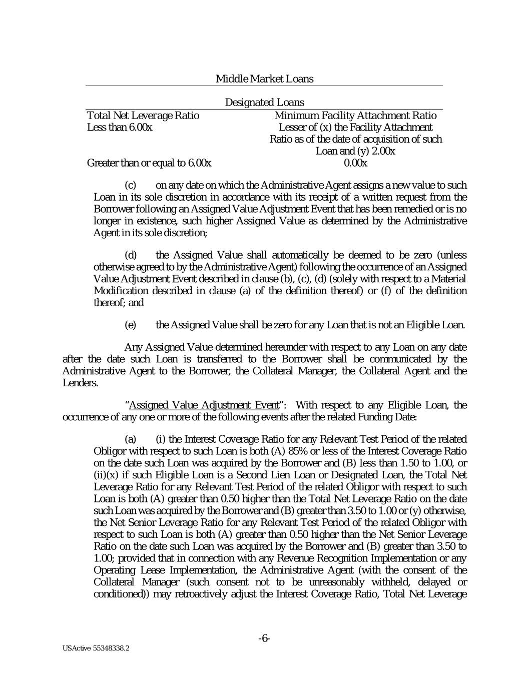 Middle Market Loans Designated Loans Total Net Leverage Ratio Minimum Facility Attachment Ratio Less than 6.00x Lesser of (x) the Facility Attachment Ratio as of the date of acquisition of such Loan and (y) 2.00x Greater than or equal to 6.00x 0.00x (c) on any date on which the Administrative Agent assigns a new value to such Loan in its sole discretion in accordance with its receipt of a written request from the Borrower following an Assigned Value Adjustment Event that has been remedied or is no longer in existence, such higher Assigned Value as determined by the Administrative Agent in its sole discretion; (d) the Assigned Value shall automatically be deemed to be zero (unless otherwise agreed to by the Administrative Agent) following the occurrence of an Assigned Value Adjustment Event described in clause (b), (c), (d) (solely with respect to a Material Modification described in clause (a) of the definition thereof) or (f) of the definition thereof; and (e) the Assigned Value shall be zero for any Loan that is not an Eligible Loan. Any Assigned Value determined hereunder with respect to any Loan on any date after the date such Loan is transferred to the Borrower shall be communicated by the Administrative Agent to the Borrower, the Collateral Manager, the Collateral Agent and the Lenders. “Assigned Value Adjustment Event”: With respect to any Eligible Loan, the occurrence of any one or more of the following events after the related Funding Date: (a) (i) the Interest Coverage Ratio for any Relevant Test Period of the related Obligor with respect to such Loan is both (A) 85% or less of the Interest Coverage Ratio on the date such Loan was acquired by the Borrower and (B) less than 1.50 to 1.00, or (ii)(x) if such Eligible Loan is a Second Lien Loan or Designated Loan, the Total Net Leverage Ratio for any Relevant Test Period of the related Obligor with respect to such Loan is both (A) greater than 0.50 higher than the Total Net Leverage Ratio on the date such Loan was acquired by the Borrower and (B) greater than 3.50 to 1.00 or (y) otherwise, the Net Senior Leverage Ratio for any Relevant Test Period of the related Obligor with respect to such Loan is both (A) greater than 0.50 higher than the Net Senior Leverage Ratio on the date such Loan was acquired by the Borrower and (B) greater than 3.50 to 1.00; provided that in connection with any Revenue Recognition Implementation or any Operating Lease Implementation, the Administrative Agent (with the consent of the Collateral Manager (such consent not to be unreasonably withheld, delayed or conditioned)) may retroactively adjust the Interest Coverage Ratio, Total Net Leverage -6- USActive 55348338.2