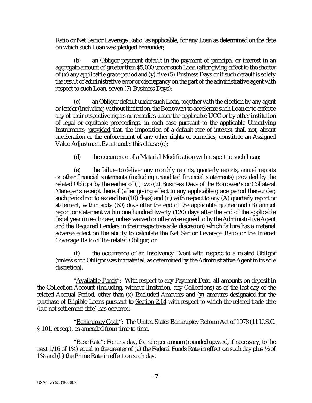 Ratio or Net Senior Leverage Ratio, as applicable, for any Loan as determined on the date on which such Loan was pledged hereunder; (b) an Obligor payment default in the payment of principal or interest in an aggregate amount of greater than $5,000 under such Loan (after giving effect to the shorter of (x) any applicable grace period and (y) five (5) Business Days or if such default is solely the result of administrative error or discrepancy on the part of the administrative agent with respect to such Loan, seven (7) Business Days); (c) an Obligor default under such Loan, together with the election by any agent or lender (including, without limitation, the Borrower) to accelerate such Loan or to enforce any of their respective rights or remedies under the applicable UCC or by other institution of legal or equitable proceedings, in each case pursuant to the applicable Underlying Instruments; provided that, the imposition of a default rate of interest shall not, absent acceleration or the enforcement of any other rights or remedies, constitute an Assigned Value Adjustment Event under this clause (c); (d) the occurrence of a Material Modification with respect to such Loan; (e) the failure to deliver any monthly reports, quarterly reports, annual reports or other financial statements (including unaudited financial statements) provided by the related Obligor by the earlier of (i) two (2) Business Days of the Borrower’s or Collateral Manager’s receipt thereof (after giving effect to any applicable grace period thereunder, such period not to exceed ten (10) days) and (ii) with respect to any (A) quarterly report or statement, within sixty (60) days after the end of the applicable quarter and (B) annual report or statement within one hundred twenty (120) days after the end of the applicable fiscal year (in each case, unless waived or otherwise agreed to by the Administrative Agent and the Required Lenders in their respective sole discretion) which failure has a material adverse effect on the ability to calculate the Net Senior Leverage Ratio or the Interest Coverage Ratio of the related Obligor; or (f) the occurrence of an Insolvency Event with respect to a related Obligor (unless such Obligor was immaterial, as determined by the Administrative Agent in its sole discretion). “Available Funds”: With respect to any Payment Date, all amounts on deposit in the Collection Account (including, without limitation, any Collections) as of the last day of the related Accrual Period, other than (x) Excluded Amounts and (y) amounts designated for the purchase of Eligible Loans pursuant to Section 2.14 with respect to which the related trade date (but not settlement date) has occurred. “Bankruptcy Code”: The United States Bankruptcy Reform Act of 1978 (11 U.S.C. § 101, et seq.), as amended from time to time. “Base Rate”: For any day, the rate per annum (rounded upward, if necessary, to the next 1/16 of 1%) equal to the greater of (a) the Federal Funds Rate in effect on such day plus ½ of 1% and (b) the Prime Rate in effect on such day. -7- USActive 55348338.2