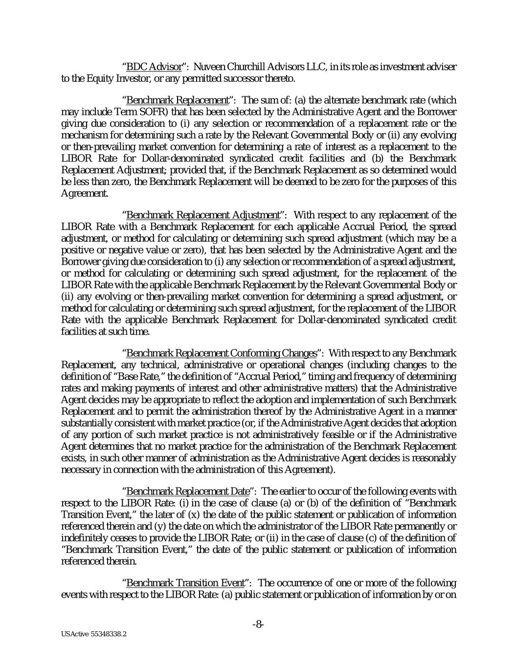 “BDC Advisor”: Nuveen Churchill Advisors LLC, in its role as investment adviser to the Equity Investor, or any permitted successor thereto. “Benchmark Replacement”: The sum of: (a) the alternate benchmark rate (which may include Term SOFR) that has been selected by the Administrative Agent and the Borrower giving due consideration to (i) any selection or recommendation of a replacement rate or the mechanism for determining such a rate by the Relevant Governmental Body or (ii) any evolving or then-prevailing market convention for determining a rate of interest as a replacement to the LIBOR Rate for Dollar-denominated syndicated credit facilities and (b) the Benchmark Replacement Adjustment; provided that, if the Benchmark Replacement as so determined would be less than zero, the Benchmark Replacement will be deemed to be zero for the purposes of this Agreement. “Benchmark Replacement Adjustment”: With respect to any replacement of the LIBOR Rate with a Benchmark Replacement for each applicable Accrual Period, the spread adjustment, or method for calculating or determining such spread adjustment (which may be a positive or negative value or zero), that has been selected by the Administrative Agent and the Borrower giving due consideration to (i) any selection or recommendation of a spread adjustment, or method for calculating or determining such spread adjustment, for the replacement of the LIBOR Rate with the applicable Benchmark Replacement by the Relevant Governmental Body or (ii) any evolving or then-prevailing market convention for determining a spread adjustment, or method for calculating or determining such spread adjustment, for the replacement of the LIBOR Rate with the applicable Benchmark Replacement for Dollar-denominated syndicated credit facilities at such time. “Benchmark Replacement Conforming Changes”: With respect to any Benchmark Replacement, any technical, administrative or operational changes (including changes to the definition of “Base Rate,” the definition of “Accrual Period,” timing and frequency of determining rates and making payments of interest and other administrative matters) that the Administrative Agent decides may be appropriate to reflect the adoption and implementation of such Benchmark Replacement and to permit the administration thereof by the Administrative Agent in a manner substantially consistent with market practice (or, if the Administrative Agent decides that adoption of any portion of such market practice is not administratively feasible or if the Administrative Agent determines that no market practice for the administration of the Benchmark Replacement exists, in such other manner of administration as the Administrative Agent decides is reasonably necessary in connection with the administration of this Agreement). “Benchmark Replacement Date”: The earlier to occur of the following events with respect to the LIBOR Rate: (i) in the case of clause (a) or (b) of the definition of “Benchmark Transition Event,” the later of (x) the date of the public statement or publication of information referenced therein and (y) the date on which the administrator of the LIBOR Rate permanently or indefinitely ceases to provide the LIBOR Rate; or (ii) in the case of clause (c) of the definition of “Benchmark Transition Event,” the date of the public statement or publication of information referenced therein. “Benchmark Transition Event”: The occurrence of one or more of the following events with respect to the LIBOR Rate: (a) public statement or publication of information by or on -8- USActive 55348338.2