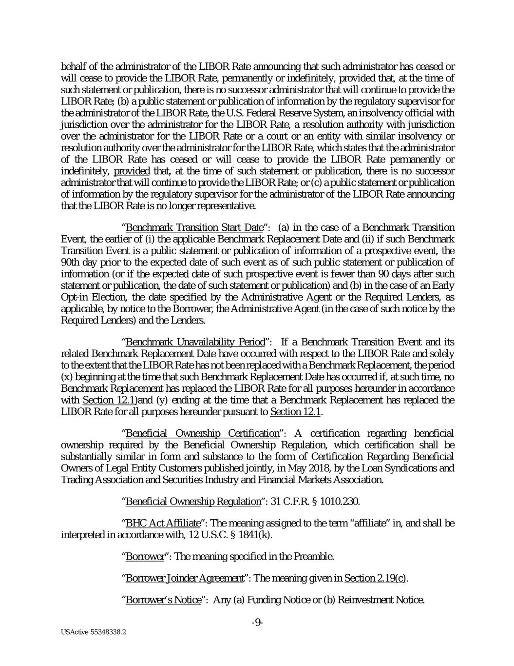behalf of the administrator of the LIBOR Rate announcing that such administrator has ceased or will cease to provide the LIBOR Rate, permanently or indefinitely, provided that, at the time of such statement or publication, there is no successor administrator that will continue to provide the LIBOR Rate; (b) a public statement or publication of information by the regulatory supervisor for the administrator of the LIBOR Rate, the U.S. Federal Reserve System, an insolvency official with jurisdiction over the administrator for the LIBOR Rate, a resolution authority with jurisdiction over the administrator for the LIBOR Rate or a court or an entity with similar insolvency or resolution authority over the administrator for the LIBOR Rate, which states that the administrator of the LIBOR Rate has ceased or will cease to provide the LIBOR Rate permanently or indefinitely, provided that, at the time of such statement or publication, there is no successor administrator that will continue to provide the LIBOR Rate; or (c) a public statement or publication of information by the regulatory supervisor for the administrator of the LIBOR Rate announcing that the LIBOR Rate is no longer representative. “Benchmark Transition Start Date”: (a) in the case of a Benchmark Transition Event, the earlier of (i) the applicable Benchmark Replacement Date and (ii) if such Benchmark Transition Event is a public statement or publication of information of a prospective event, the 90th day prior to the expected date of such event as of such public statement or publication of information (or if the expected date of such prospective event is fewer than 90 days after such statement or publication, the date of such statement or publication) and (b) in the case of an Early Opt-in Election, the date specified by the Administrative Agent or the Required Lenders, as applicable, by notice to the Borrower, the Administrative Agent (in the case of such notice by the Required Lenders) and the Lenders. “Benchmark Unavailability Period”: If a Benchmark Transition Event and its related Benchmark Replacement Date have occurred with respect to the LIBOR Rate and solely to the extent that the LIBOR Rate has not been replaced with a Benchmark Replacement, the period (x) beginning at the time that such Benchmark Replacement Date has occurred if, at such time, no Benchmark Replacement has replaced the LIBOR Rate for all purposes hereunder in accordance with Section 12.1)and (y) ending at the time that a Benchmark Replacement has replaced the LIBOR Rate for all purposes hereunder pursuant to Section 12.1. “Beneficial Ownership Certification”: A certification regarding beneficial ownership required by the Beneficial Ownership Regulation, which certification shall be substantially similar in form and substance to the form of Certification Regarding Beneficial Owners of Legal Entity Customers published jointly, in May 2018, by the Loan Syndications and Trading Association and Securities Industry and Financial Markets Association. “Beneficial Ownership Regulation”: 31 C.F.R. § 1010.230. “BHC Act Affiliate”: The meaning assigned to the term “affiliate” in, and shall be interpreted in accordance with, 12 U.S.C. § 1841(k). “Borrower”: The meaning specified in the Preamble. “Borrower Joinder Agreement”: The meaning given in Section 2.19(c). “Borrower’s Notice”: Any (a) Funding Notice or (b) Reinvestment Notice. -9- USActive 55348338.2