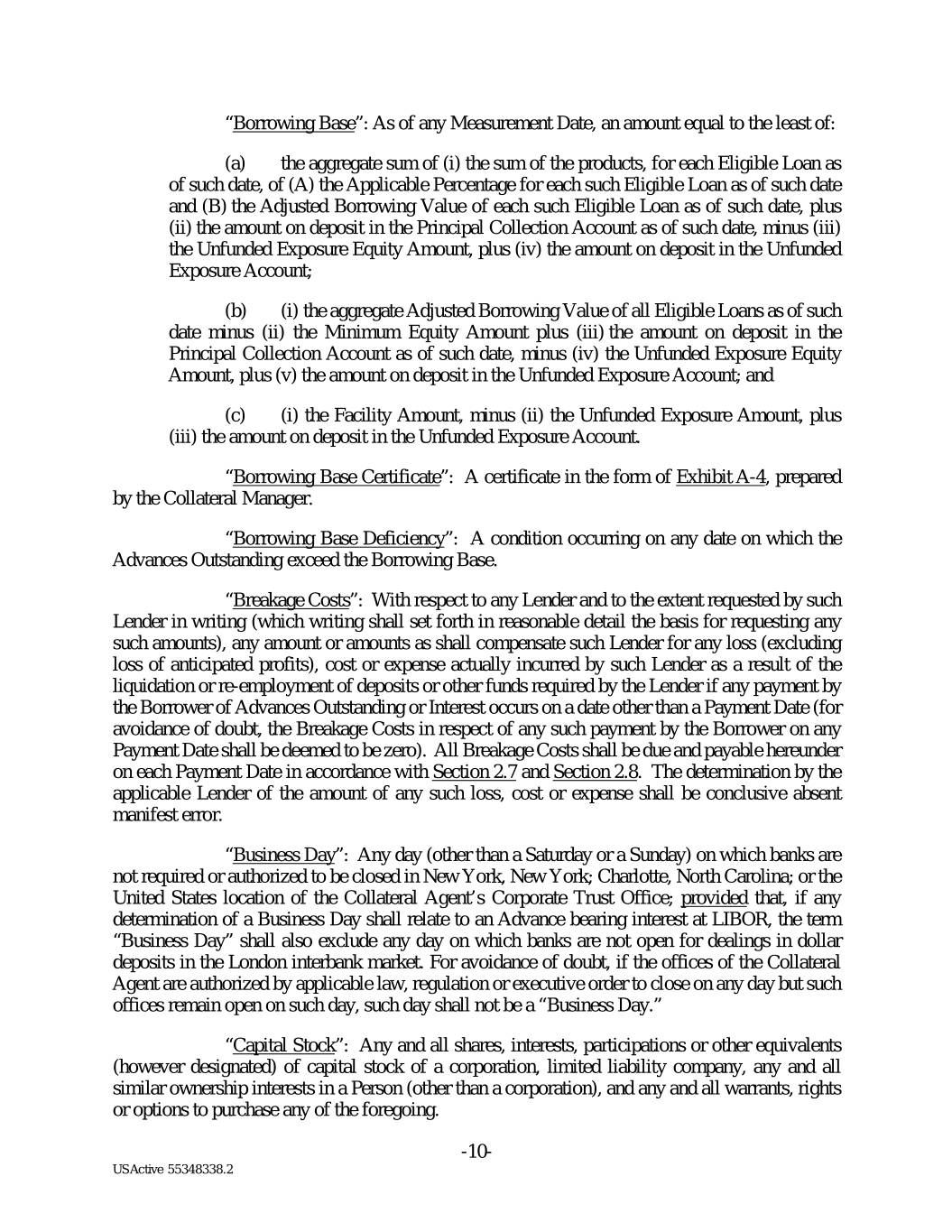 “Borrowing Base”: As of any Measurement Date, an amount equal to the least of: (a) the aggregate sum of (i) the sum of the products, for each Eligible Loan as of such date, of (A) the Applicable Percentage for each such Eligible Loan as of such date and (B) the Adjusted Borrowing Value of each such Eligible Loan as of such date, plus (ii) the amount on deposit in the Principal Collection Account as of such date, minus (iii) the Unfunded Exposure Equity Amount, plus (iv) the amount on deposit in the Unfunded Exposure Account; (b) (i) the aggregate Adjusted Borrowing Value of all Eligible Loans as of such date minus (ii) the Minimum Equity Amount plus (iii) the amount on deposit in the Principal Collection Account as of such date, minus (iv) the Unfunded Exposure Equity Amount, plus (v) the amount on deposit in the Unfunded Exposure Account; and (c) (i) the Facility Amount, minus (ii) the Unfunded Exposure Amount, plus (iii) the amount on deposit in the Unfunded Exposure Account. “Borrowing Base Certificate”: A certificate in the form of Exhibit A-4, prepared by the Collateral Manager. “Borrowing Base Deficiency”: A condition occurring on any date on which the Advances Outstanding exceed the Borrowing Base. “Breakage Costs”: With respect to any Lender and to the extent requested by such Lender in writing (which writing shall set forth in reasonable detail the basis for requesting any such amounts), any amount or amounts as shall compensate such Lender for any loss (excluding loss of anticipated profits), cost or expense actually incurred by such Lender as a result of the liquidation or re-employment of deposits or other funds required by the Lender if any payment by the Borrower of Advances Outstanding or Interest occurs on a date other than a Payment Date (for avoidance of doubt, the Breakage Costs in respect of any such payment by the Borrower on any Payment Date shall be deemed to be zero). All Breakage Costs shall be due and payable hereunder on each Payment Date in accordance with Section 2.7 and Section 2.8. The determination by the applicable Lender of the amount of any such loss, cost or expense shall be conclusive absent manifest error. “Business Day”: Any day (other than a Saturday or a Sunday) on which banks are not required or authorized to be closed in New York, New York; Charlotte, North Carolina; or the United States location of the Collateral Agent’s Corporate Trust Office; provided that, if any determination of a Business Day shall relate to an Advance bearing interest at LIBOR, the term “Business Day” shall also exclude any day on which banks are not open for dealings in dollar deposits in the London interbank market. For avoidance of doubt, if the offices of the Collateral Agent are authorized by applicable law, regulation or executive order to close on any day but such offices remain open on such day, such day shall not be a “Business Day.” “Capital Stock”: Any and all shares, interests, participations or other equivalents (however designated) of capital stock of a corporation, limited liability company, any and all similar ownership interests in a Person (other than a corporation), and any and all warrants, rights or options to purchase any of the foregoing. -10- USActive 55348338.2