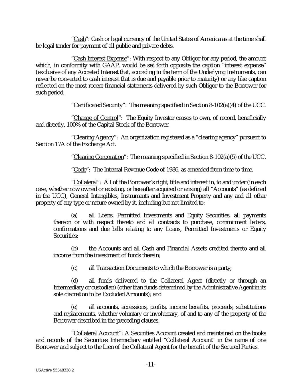 “Cash”: Cash or legal currency of the United States of America as at the time shall be legal tender for payment of all public and private debts. “Cash Interest Expense”: With respect to any Obligor for any period, the amount which, in conformity with GAAP, would be set forth opposite the caption “interest expense” (exclusive of any Accreted Interest that, according to the term of the Underlying Instruments, can never be converted to cash interest that is due and payable prior to maturity) or any like caption reflected on the most recent financial statements delivered by such Obligor to the Borrower for such period. “Certificated Security”: The meaning specified in Section 8-102(a)(4) of the UCC. “Change of Control”: The Equity Investor ceases to own, of record, beneficially and directly, 100% of the Capital Stock of the Borrower. “Clearing Agency”: An organization registered as a “clearing agency” pursuant to Section 17A of the Exchange Act. “Clearing Corporation”: The meaning specified in Section 8-102(a)(5) of the UCC. “Code”: The Internal Revenue Code of 1986, as amended from time to time. “Collateral”: All of the Borrower’s right, title and interest in, to and under (in each case, whether now owned or existing, or hereafter acquired or arising) all “Accounts” (as defined in the UCC), General Intangibles, Instruments and Investment Property and any and all other property of any type or nature owned by it, including but not limited to: (a) all Loans, Permitted Investments and Equity Securities, all payments thereon or with respect thereto and all contracts to purchase, commitment letters, confirmations and due bills relating to any Loans, Permitted Investments or Equity Securities; (b) the Accounts and all Cash and Financial Assets credited thereto and all income from the investment of funds therein; (c) all Transaction Documents to which the Borrower is a party; (d) all funds delivered to the Collateral Agent (directly or through an Intermediary or custodian) (other than funds determined by the Administrative Agent in its sole discretion to be Excluded Amounts); and (e) all accounts, accessions, profits, income benefits, proceeds, substitutions and replacements, whether voluntary or involuntary, of and to any of the property of the Borrower described in the preceding clauses. “Collateral Account”: A Securities Account created and maintained on the books and records of the Securities Intermediary entitled “Collateral Account” in the name of one Borrower and subject to the Lien of the Collateral Agent for the benefit of the Secured Parties. -11- USActive 55348338.2