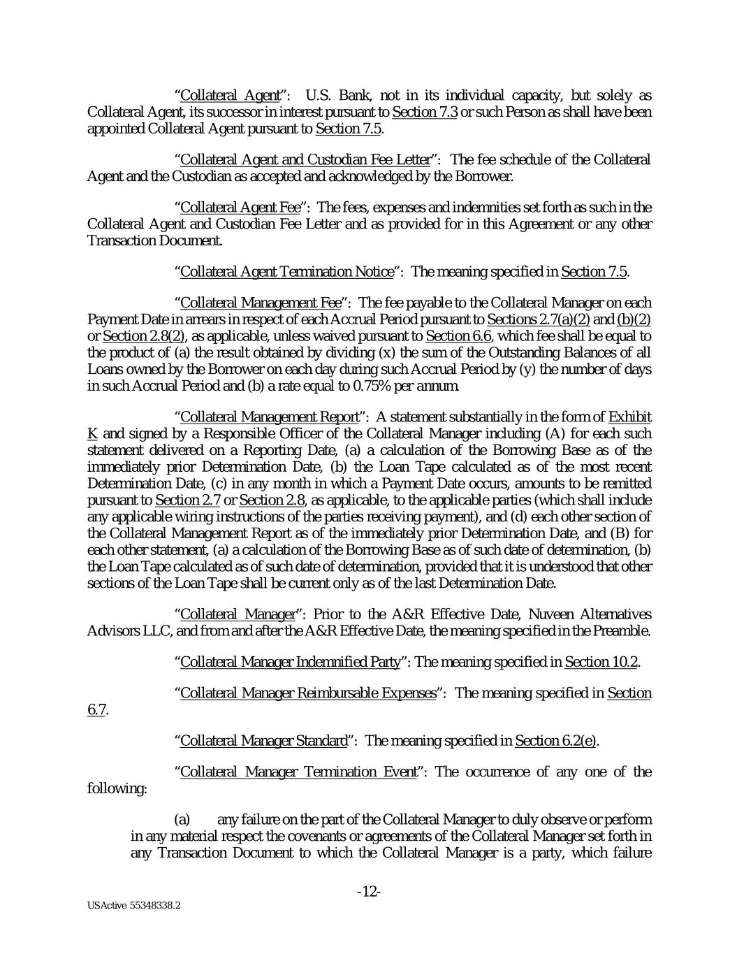 “Collateral Agent”: U.S. Bank, not in its individual capacity, but solely as Collateral Agent, its successor in interest pursuant to Section 7.3 or such Person as shall have been appointed Collateral Agent pursuant to Section 7.5. “Collateral Agent and Custodian Fee Letter”: The fee schedule of the Collateral Agent and the Custodian as accepted and acknowledged by the Borrower. “Collateral Agent Fee”: The fees, expenses and indemnities set forth as such in the Collateral Agent and Custodian Fee Letter and as provided for in this Agreement or any other Transaction Document. “Collateral Agent Termination Notice”: The meaning specified in Section 7.5. “Collateral Management Fee”: The fee payable to the Collateral Manager on each Payment Date in arrears in respect of each Accrual Period pursuant to Sections 2.7(a)(2) and (b)(2) or Section 2.8(2), as applicable, unless waived pursuant to Section 6.6, which fee shall be equal to the product of (a) the result obtained by dividing (x) the sum of the Outstanding Balances of all Loans owned by the Borrower on each day during such Accrual Period by (y) the number of days in such Accrual Period and (b) a rate equal to 0.75% per annum. “Collateral Management Report”: A statement substantially in the form of Exhibit K and signed by a Responsible Officer of the Collateral Manager including (A) for each such statement delivered on a Reporting Date, (a) a calculation of the Borrowing Base as of the immediately prior Determination Date, (b) the Loan Tape calculated as of the most recent Determination Date, (c) in any month in which a Payment Date occurs, amounts to be remitted pursuant to Section 2.7 or Section 2.8, as applicable, to the applicable parties (which shall include any applicable wiring instructions of the parties receiving payment), and (d) each other section of the Collateral Management Report as of the immediately prior Determination Date, and (B) for each other statement, (a) a calculation of the Borrowing Base as of such date of determination, (b) the Loan Tape calculated as of such date of determination, provided that it is understood that other sections of the Loan Tape shall be current only as of the last Determination Date. “Collateral Manager”: Prior to the A&R Effective Date, Nuveen Alternatives Advisors LLC, and from and after the A&R Effective Date, the meaning specified in the Preamble. “Collateral Manager Indemnified Party”: The meaning specified in Section 10.2. “Collateral Manager Reimbursable Expenses”: The meaning specified in Section 6.7. “Collateral Manager Standard”: The meaning specified in Section 6.2(e). “Collateral Manager Termination Event”: The occurrence of any one of the following: (a) any failure on the part of the Collateral Manager to duly observe or perform in any material respect the covenants or agreements of the Collateral Manager set forth in any Transaction Document to which the Collateral Manager is a party, which failure -12- USActive 55348338.2
