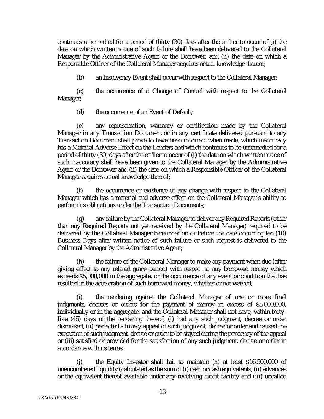 continues unremedied for a period of thirty (30) days after the earlier to occur of (i) the date on which written notice of such failure shall have been delivered to the Collateral Manager by the Administrative Agent or the Borrower, and (ii) the date on which a Responsible Officer of the Collateral Manager acquires actual knowledge thereof; (b) an Insolvency Event shall occur with respect to the Collateral Manager; (c) the occurrence of a Change of Control with respect to the Collateral Manager; (d) the occurrence of an Event of Default; (e) any representation, warranty or certification made by the Collateral Manager in any Transaction Document or in any certificate delivered pursuant to any Transaction Document shall prove to have been incorrect when made, which inaccuracy has a Material Adverse Effect on the Lenders and which continues to be unremedied for a period of thirty (30) days after the earlier to occur of (i) the date on which written notice of such inaccuracy shall have been given to the Collateral Manager by the Administrative Agent or the Borrower and (ii) the date on which a Responsible Officer of the Collateral Manager acquires actual knowledge thereof; (f) the occurrence or existence of any change with respect to the Collateral Manager which has a material and adverse effect on the Collateral Manager’s ability to perform its obligations under the Transaction Documents; (g) any failure by the Collateral Manager to deliver any Required Reports (other than any Required Reports not yet received by the Collateral Manager) required to be delivered by the Collateral Manager hereunder on or before the date occurring ten (10) Business Days after written notice of such failure or such request is delivered to the Collateral Manager by the Administrative Agent; (h) the failure of the Collateral Manager to make any payment when due (after giving effect to any related grace period) with respect to any borrowed money which exceeds $5,000,000 in the aggregate, or the occurrence of any event or condition that has resulted in the acceleration of such borrowed money, whether or not waived; (i) the rendering against the Collateral Manager of one or more final judgments, decrees or orders for the payment of money in excess of $5,000,000, individually or in the aggregate, and the Collateral Manager shall not have, within forty- five (45) days of the rendering thereof, (i) had any such judgment, decree or order dismissed, (ii) perfected a timely appeal of such judgment, decree or order and caused the execution of such judgment, decree or order to be stayed during the pendency of the appeal or (iii) satisfied or provided for the satisfaction of any such judgment, decree or order in accordance with its terms; (j) the Equity Investor shall fail to maintain (x) at least $16,500,000 of unencumbered liquidity (calculated as the sum of (i) cash or cash equivalents, (ii) advances or the equivalent thereof available under any revolving credit facility and (iii) uncalled -13- USActive 55348338.2