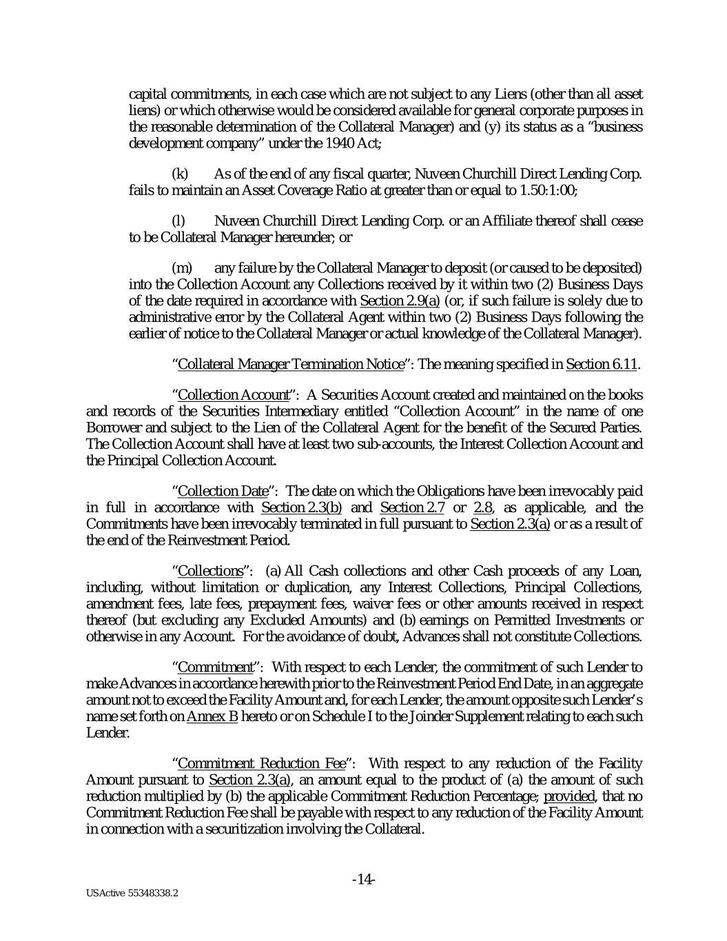 capital commitments, in each case which are not subject to any Liens (other than all asset liens) or which otherwise would be considered available for general corporate purposes in the reasonable determination of the Collateral Manager) and (y) its status as a “business development company” under the 1940 Act; (k) As of the end of any fiscal quarter, Nuveen Churchill Direct Lending Corp. fails to maintain an Asset Coverage Ratio at greater than or equal to 1.50:1:00; (l) Nuveen Churchill Direct Lending Corp. or an Affiliate thereof shall cease to be Collateral Manager hereunder; or (m) any failure by the Collateral Manager to deposit (or caused to be deposited) into the Collection Account any Collections received by it within two (2) Business Days of the date required in accordance with Section 2.9(a) (or, if such failure is solely due to administrative error by the Collateral Agent within two (2) Business Days following the earlier of notice to the Collateral Manager or actual knowledge of the Collateral Manager). “Collateral Manager Termination Notice”: The meaning specified in Section 6.11. “Collection Account”: A Securities Account created and maintained on the books and records of the Securities Intermediary entitled “Collection Account” in the name of one Borrower and subject to the Lien of the Collateral Agent for the benefit of the Secured Parties. The Collection Account shall have at least two sub-accounts, the Interest Collection Account and the Principal Collection Account. “Collection Date”: The date on which the Obligations have been irrevocably paid in full in accordance with Section 2.3(b) and Section 2.7 or 2.8, as applicable, and the Commitments have been irrevocably terminated in full pursuant to Section 2.3(a) or as a result of the end of the Reinvestment Period. “Collections”: (a) All Cash collections and other Cash proceeds of any Loan, including, without limitation or duplication, any Interest Collections, Principal Collections, amendment fees, late fees, prepayment fees, waiver fees or other amounts received in respect thereof (but excluding any Excluded Amounts) and (b) earnings on Permitted Investments or otherwise in any Account. For the avoidance of doubt, Advances shall not constitute Collections. “Commitment”: With respect to each Lender, the commitment of such Lender to make Advances in accordance herewith prior to the Reinvestment Period End Date, in an aggregate amount not to exceed the Facility Amount and, for each Lender, the amount opposite such Lender’s name set forth on Annex B hereto or on Schedule I to the Joinder Supplement relating to each such Lender. “Commitment Reduction Fee”: With respect to any reduction of the Facility Amount pursuant to Section 2.3(a), an amount equal to the product of (a) the amount of such reduction multiplied by (b) the applicable Commitment Reduction Percentage; provided, that no Commitment Reduction Fee shall be payable with respect to any reduction of the Facility Amount in connection with a securitization involving the Collateral. -14- USActive 55348338.2