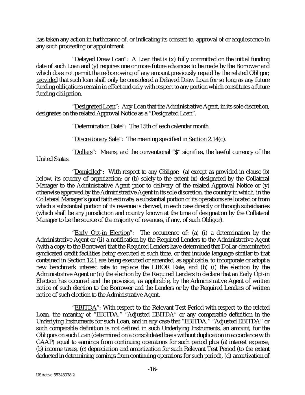 has taken any action in furtherance of, or indicating its consent to, approval of or acquiescence in any such proceeding or appointment. “Delayed Draw Loan”: A Loan that is (x) fully committed on the initial funding date of such Loan and (y) requires one or more future advances to be made by the Borrower and which does not permit the re-borrowing of any amount previously repaid by the related Obligor; provided that such loan shall only be considered a Delayed Draw Loan for so long as any future funding obligations remain in effect and only with respect to any portion which constitutes a future funding obligation. “Designated Loan”: Any Loan that the Administrative Agent, in its sole discretion, designates on the related Approval Notice as a “Designated Loan”. “Determination Date”: The 15th of each calendar month. “Discretionary Sale”: The meaning specified in Section 2.14(c). “Dollars”: Means, and the conventional “$” signifies, the lawful currency of the United States. “Domiciled”: With respect to any Obligor: (a) except as provided in clause (b) below, its country of organization; or (b) solely to the extent (x) designated by the Collateral Manager to the Administrative Agent prior to delivery of the related Approval Notice or (y) otherwise approved by the Administrative Agent in its sole discretion, the country in which, in the Collateral Manager’s good faith estimate, a substantial portion of its operations are located or from which a substantial portion of its revenue is derived, in each case directly or through subsidiaries (which shall be any jurisdiction and country known at the time of designation by the Collateral Manager to be the source of the majority of revenues, if any, of such Obligor). “Early Opt-in Election”: The occurrence of: (a) (i) a determination by the Administrative Agent or (ii) a notification by the Required Lenders to the Administrative Agent (with a copy to the Borrower) that the Required Lenders have determined that Dollar-denominated syndicated credit facilities being executed at such time, or that include language similar to that contained in Section 12.1 are being executed or amended, as applicable, to incorporate or adopt a new benchmark interest rate to replace the LIBOR Rate, and (b) (i) the election by the Administrative Agent or (ii) the election by the Required Lenders to declare that an Early Opt-in Election has occurred and the provision, as applicable, by the Administrative Agent of written notice of such election to the Borrower and the Lenders or by the Required Lenders of written notice of such election to the Administrative Agent. “EBITDA”: With respect to the Relevant Test Period with respect to the related Loan, the meaning of “EBITDA,” “Adjusted EBITDA” or any comparable definition in the Underlying Instruments for such Loan, and in any case that “EBITDA,” “Adjusted EBITDA” or such comparable definition is not defined in such Underlying Instruments, an amount, for the Obligors on such Loan (determined on a consolidated basis without duplication in accordance with GAAP) equal to earnings from continuing operations for such period plus (a) interest expense, (b) income taxes, (c) depreciation and amortization for such Relevant Test Period (to the extent deducted in determining earnings from continuing operations for such period), (d) amortization of -16- USActive 55348338.2