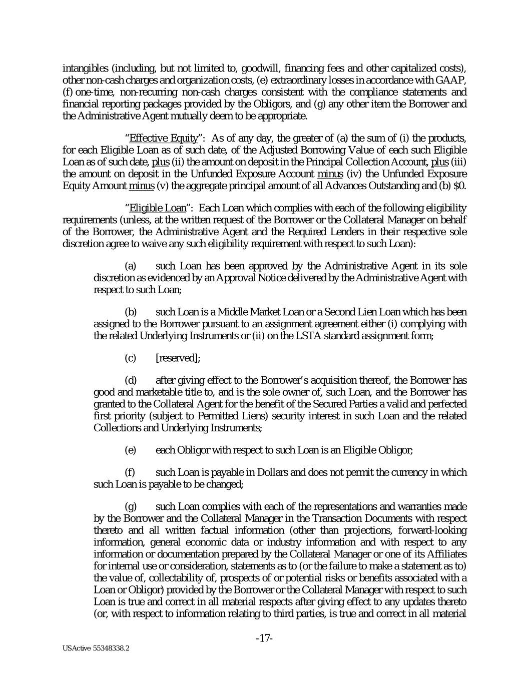 intangibles (including, but not limited to, goodwill, financing fees and other capitalized costs), other non-cash charges and organization costs, (e) extraordinary losses in accordance with GAAP, (f) one-time, non-recurring non-cash charges consistent with the compliance statements and financial reporting packages provided by the Obligors, and (g) any other item the Borrower and the Administrative Agent mutually deem to be appropriate. “Effective Equity”: As of any day, the greater of (a) the sum of (i) the products, for each Eligible Loan as of such date, of the Adjusted Borrowing Value of each such Eligible Loan as of such date, plus (ii) the amount on deposit in the Principal Collection Account, plus (iii) the amount on deposit in the Unfunded Exposure Account minus (iv) the Unfunded Exposure Equity Amount minus (v) the aggregate principal amount of all Advances Outstanding and (b) $0. “Eligible Loan”: Each Loan which complies with each of the following eligibility requirements (unless, at the written request of the Borrower or the Collateral Manager on behalf of the Borrower, the Administrative Agent and the Required Lenders in their respective sole discretion agree to waive any such eligibility requirement with respect to such Loan): (a) such Loan has been approved by the Administrative Agent in its sole discretion as evidenced by an Approval Notice delivered by the Administrative Agent with respect to such Loan; (b) such Loan is a Middle Market Loan or a Second Lien Loan which has been assigned to the Borrower pursuant to an assignment agreement either (i) complying with the related Underlying Instruments or (ii) on the LSTA standard assignment form; (c) [reserved]; (d) after giving effect to the Borrower’s acquisition thereof, the Borrower has good and marketable title to, and is the sole owner of, such Loan, and the Borrower has granted to the Collateral Agent for the benefit of the Secured Parties a valid and perfected first priority (subject to Permitted Liens) security interest in such Loan and the related Collections and Underlying Instruments; (e) each Obligor with respect to such Loan is an Eligible Obligor; (f) such Loan is payable in Dollars and does not permit the currency in which such Loan is payable to be changed; (g) such Loan complies with each of the representations and warranties made by the Borrower and the Collateral Manager in the Transaction Documents with respect thereto and all written factual information (other than projections, forward-looking information, general economic data or industry information and with respect to any information or documentation prepared by the Collateral Manager or one of its Affiliates for internal use or consideration, statements as to (or the failure to make a statement as to) the value of, collectability of, prospects of or potential risks or benefits associated with a Loan or Obligor) provided by the Borrower or the Collateral Manager with respect to such Loan is true and correct in all material respects after giving effect to any updates thereto (or, with respect to information relating to third parties, is true and correct in all material -17- USActive 55348338.2