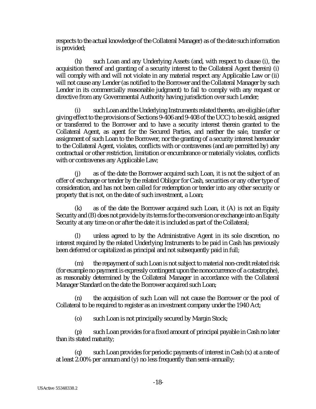 respects to the actual knowledge of the Collateral Manager) as of the date such information is provided; (h) such Loan and any Underlying Assets (and, with respect to clause (i), the acquisition thereof and granting of a security interest to the Collateral Agent therein) (i) will comply with and will not violate in any material respect any Applicable Law or (ii) will not cause any Lender (as notified to the Borrower and the Collateral Manager by such Lender in its commercially reasonable judgment) to fail to comply with any request or directive from any Governmental Authority having jurisdiction over such Lender; (i) such Loan and the Underlying Instruments related thereto, are eligible (after giving effect to the provisions of Sections 9-406 and 9-408 of the UCC) to be sold, assigned or transferred to the Borrower and to have a security interest therein granted to the Collateral Agent, as agent for the Secured Parties, and neither the sale, transfer or assignment of such Loan to the Borrower, nor the granting of a security interest hereunder to the Collateral Agent, violates, conflicts with or contravenes (and are permitted by) any contractual or other restriction, limitation or encumbrance or materially violates, conflicts with or contravenes any Applicable Law; (j) as of the date the Borrower acquired such Loan, it is not the subject of an offer of exchange or tender by the related Obligor for Cash, securities or any other type of consideration, and has not been called for redemption or tender into any other security or property that is not, on the date of such investment, a Loan; (k) as of the date the Borrower acquired such Loan, it (A) is not an Equity Security and (B) does not provide by its terms for the conversion or exchange into an Equity Security at any time on or after the date it is included as part of the Collateral; (l) unless agreed to by the Administrative Agent in its sole discretion, no interest required by the related Underlying Instruments to be paid in Cash has previously been deferred or capitalized as principal and not subsequently paid in full; (m) the repayment of such Loan is not subject to material non-credit related risk (for example no payment is expressly contingent upon the nonoccurrence of a catastrophe), as reasonably determined by the Collateral Manager in accordance with the Collateral Manager Standard on the date the Borrower acquired such Loan; (n) the acquisition of such Loan will not cause the Borrower or the pool of Collateral to be required to register as an investment company under the 1940 Act; (o) such Loan is not principally secured by Margin Stock; (p) such Loan provides for a fixed amount of principal payable in Cash no later than its stated maturity; (q) such Loan provides for periodic payments of interest in Cash (x) at a rate of at least 2.00% per annum and (y) no less frequently than semi-annually; -18- USActive 55348338.2