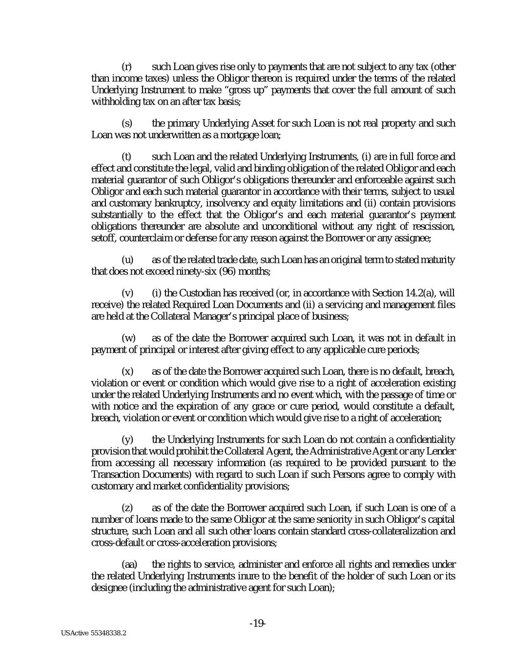 (r) such Loan gives rise only to payments that are not subject to any tax (other than income taxes) unless the Obligor thereon is required under the terms of the related Underlying Instrument to make “gross up” payments that cover the full amount of such withholding tax on an after tax basis; (s) the primary Underlying Asset for such Loan is not real property and such Loan was not underwritten as a mortgage loan; (t) such Loan and the related Underlying Instruments, (i) are in full force and effect and constitute the legal, valid and binding obligation of the related Obligor and each material guarantor of such Obligor’s obligations thereunder and enforceable against such Obligor and each such material guarantor in accordance with their terms, subject to usual and customary bankruptcy, insolvency and equity limitations and (ii) contain provisions substantially to the effect that the Obligor’s and each material guarantor’s payment obligations thereunder are absolute and unconditional without any right of rescission, setoff, counterclaim or defense for any reason against the Borrower or any assignee; (u) as of the related trade date, such Loan has an original term to stated maturity that does not exceed ninety-six (96) months; (v) (i) the Custodian has received (or, in accordance with Section 14.2(a), will receive) the related Required Loan Documents and (ii) a servicing and management files are held at the Collateral Manager’s principal place of business; (w) as of the date the Borrower acquired such Loan, it was not in default in payment of principal or interest after giving effect to any applicable cure periods; (x) as of the date the Borrower acquired such Loan, there is no default, breach, violation or event or condition which would give rise to a right of acceleration existing under the related Underlying Instruments and no event which, with the passage of time or with notice and the expiration of any grace or cure period, would constitute a default, breach, violation or event or condition which would give rise to a right of acceleration; (y) the Underlying Instruments for such Loan do not contain a confidentiality provision that would prohibit the Collateral Agent, the Administrative Agent or any Lender from accessing all necessary information (as required to be provided pursuant to the Transaction Documents) with regard to such Loan if such Persons agree to comply with customary and market confidentiality provisions; (z) as of the date the Borrower acquired such Loan, if such Loan is one of a number of loans made to the same Obligor at the same seniority in such Obligor’s capital structure, such Loan and all such other loans contain standard cross-collateralization and cross-default or cross-acceleration provisions; (aa) the rights to service, administer and enforce all rights and remedies under the related Underlying Instruments inure to the benefit of the holder of such Loan or its designee (including the administrative agent for such Loan); -19- USActive 55348338.2
