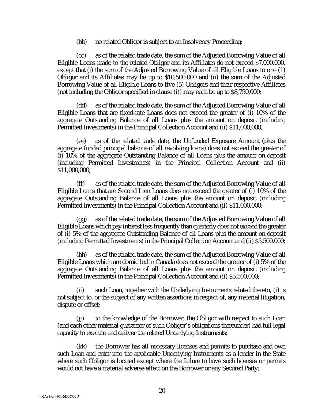 (bb) no related Obligor is subject to an Insolvency Proceeding; (cc) as of the related trade date, the sum of the Adjusted Borrowing Value of all Eligible Loans made to the related Obligor and its Affiliates do not exceed $7,000,000, except that (i) the sum of the Adjusted Borrowing Value of all Eligible Loans to one (1) Obligor and its Affiliates may be up to $10,500,000 and (ii) the sum of the Adjusted Borrowing Value of all Eligible Loans to five (5) Obligors and their respective Affiliates (not including the Obligor specified in clause (i)) may each be up to $8,750,000; (dd) as of the related trade date, the sum of the Adjusted Borrowing Value of all Eligible Loans that are fixed-rate Loans does not exceed the greater of (i) 10% of the aggregate Outstanding Balance of all Loans plus the amount on deposit (including Permitted Investments) in the Principal Collection Account and (ii) $11,000,000; (ee) as of the related trade date, the Unfunded Exposure Amount (plus the aggregate funded principal balance of all revolving loans) does not exceed the greater of (i) 10% of the aggregate Outstanding Balance of all Loans plus the amount on deposit (including Permitted Investments) in the Principal Collection Account and (ii) $11,000,000; (ff) as of the related trade date, the sum of the Adjusted Borrowing Value of all Eligible Loans that are Second Lien Loans does not exceed the greater of (i) 10% of the aggregate Outstanding Balance of all Loans plus the amount on deposit (including Permitted Investments) in the Principal Collection Account and (ii) $11,000,000; (gg) as of the related trade date, the sum of the Adjusted Borrowing Value of all Eligible Loans which pay interest less frequently than quarterly does not exceed the greater of (i) 5% of the aggregate Outstanding Balance of all Loans plus the amount on deposit (including Permitted Investments) in the Principal Collection Account and (ii) $5,500,000; (hh) as of the related trade date, the sum of the Adjusted Borrowing Value of all Eligible Loans which are domiciled in Canada does not exceed the greater of (i) 5% of the aggregate Outstanding Balance of all Loans plus the amount on deposit (including Permitted Investments) in the Principal Collection Account and (ii) $5,500,000; (ii) such Loan, together with the Underlying Instruments related thereto, (i) is not subject to, or the subject of any written assertions in respect of, any material litigation, dispute or offset; (jj) to the knowledge of the Borrower, the Obligor with respect to such Loan (and each other material guarantor of such Obligor’s obligations thereunder) had full legal capacity to execute and deliver the related Underlying Instruments; (kk) the Borrower has all necessary licenses and permits to purchase and own such Loan and enter into the applicable Underlying Instruments as a lender in the State where such Obligor is located except where the failure to have such licenses or permits would not have a material adverse effect on the Borrower or any Secured Party; -20- USActive 55348338.2