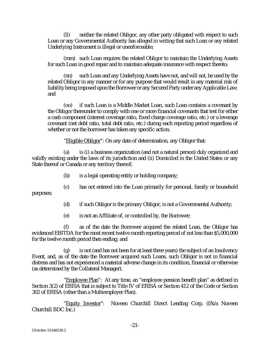 (ll) neither the related Obligor, any other party obligated with respect to such Loan or any Governmental Authority has alleged in writing that such Loan or any related Underlying Instrument is illegal or unenforceable; (mm) such Loan requires the related Obligor to maintain the Underlying Assets for such Loan in good repair and to maintain adequate insurance with respect thereto; (nn) such Loan and any Underlying Assets have not, and will not, be used by the related Obligor in any manner or for any purpose that would result in any material risk of liability being imposed upon the Borrower or any Secured Party under any Applicable Law; and (oo) if such Loan is a Middle Market Loan, such Loan contains a covenant by the Obligor thereunder to comply with one or more financial covenants that test for either a cash component (interest coverage ratio, fixed charge coverage ratio, etc.) or a leverage covenant (net debt ratio, total debt ratio, etc.) during each reporting period regardless of whether or not the borrower has taken any specific action. “Eligible Obligor”: On any date of determination, any Obligor that: (a) is (i) a business organization (and not a natural person) duly organized and validly existing under the laws of its jurisdiction and (ii) Domiciled in the United States or any State thereof or Canada or any territory thereof; (b) is a legal operating entity or holding company; (c) has not entered into the Loan primarily for personal, family or household purposes; (d) if such Obligor is the primary Obligor, is not a Governmental Authority; (e) is not an Affiliate of, or controlled by, the Borrower; (f) as of the date the Borrower acquired the related Loan, the Obligor has evidenced EBITDA for the most recent twelve month reporting period of not less than $5,000,000 for the twelve month period then ending; and (g) is not (and has not been for at least three years) the subject of an Insolvency Event, and, as of the date the Borrower acquired such Loans, such Obligor is not in financial distress and has not experienced a material adverse change in its condition, financial or otherwise (as determined by the Collateral Manager). “Employee Plan”: At any time, an “employee pension benefit plan” as defined in Section 3(2) of ERISA that is subject to Title IV of ERISA or Section 412 of the Code or Section 302 of ERISA (other than a Multiemployer Plan). “Equity Investor”: Nuveen Churchill Direct Lending Corp. (f/k/a Nuveen Churchill BDC Inc.) -21- USActive 55348338.2