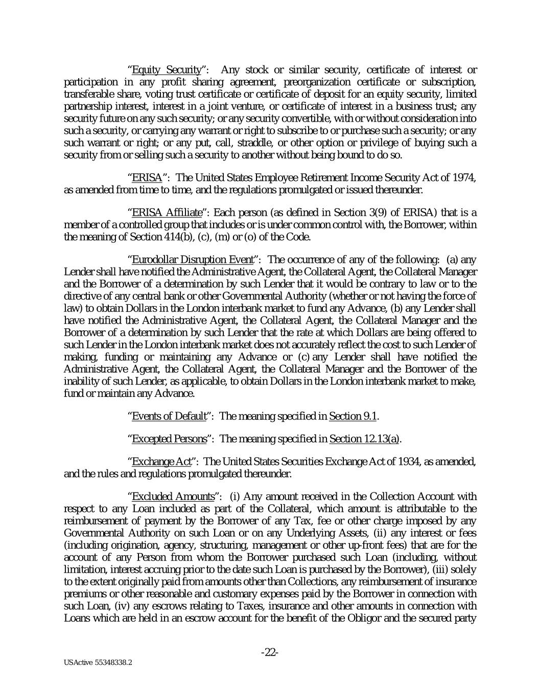 “Equity Security”: Any stock or similar security, certificate of interest or participation in any profit sharing agreement, preorganization certificate or subscription, transferable share, voting trust certificate or certificate of deposit for an equity security, limited partnership interest, interest in a joint venture, or certificate of interest in a business trust; any security future on any such security; or any security convertible, with or without consideration into such a security, or carrying any warrant or right to subscribe to or purchase such a security; or any such warrant or right; or any put, call, straddle, or other option or privilege of buying such a security from or selling such a security to another without being bound to do so. “ERISA”: The United States Employee Retirement Income Security Act of 1974, as amended from time to time, and the regulations promulgated or issued thereunder. “ERISA Affiliate”: Each person (as defined in Section 3(9) of ERISA) that is a member of a controlled group that includes or is under common control with, the Borrower, within the meaning of Section 414(b), (c), (m) or (o) of the Code. “Eurodollar Disruption Event”: The occurrence of any of the following: (a) any Lender shall have notified the Administrative Agent, the Collateral Agent, the Collateral Manager and the Borrower of a determination by such Lender that it would be contrary to law or to the directive of any central bank or other Governmental Authority (whether or not having the force of law) to obtain Dollars in the London interbank market to fund any Advance, (b) any Lender shall have notified the Administrative Agent, the Collateral Agent, the Collateral Manager and the Borrower of a determination by such Lender that the rate at which Dollars are being offered to such Lender in the London interbank market does not accurately reflect the cost to such Lender of making, funding or maintaining any Advance or (c) any Lender shall have notified the Administrative Agent, the Collateral Agent, the Collateral Manager and the Borrower of the inability of such Lender, as applicable, to obtain Dollars in the London interbank market to make, fund or maintain any Advance. “Events of Default”: The meaning specified in Section 9.1. “Excepted Persons”: The meaning specified in Section 12.13(a). “Exchange Act”: The United States Securities Exchange Act of 1934, as amended, and the rules and regulations promulgated thereunder. “Excluded Amounts”: (i) Any amount received in the Collection Account with respect to any Loan included as part of the Collateral, which amount is attributable to the reimbursement of payment by the Borrower of any Tax, fee or other charge imposed by any Governmental Authority on such Loan or on any Underlying Assets, (ii) any interest or fees (including origination, agency, structuring, management or other up-front fees) that are for the account of any Person from whom the Borrower purchased such Loan (including, without limitation, interest accruing prior to the date such Loan is purchased by the Borrower), (iii) solely to the extent originally paid from amounts other than Collections, any reimbursement of insurance premiums or other reasonable and customary expenses paid by the Borrower in connection with such Loan, (iv) any escrows relating to Taxes, insurance and other amounts in connection with Loans which are held in an escrow account for the benefit of the Obligor and the secured party -22- USActive 55348338.2