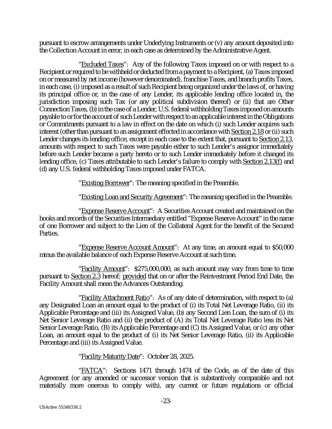 pursuant to escrow arrangements under Underlying Instruments or (v) any amount deposited into the Collection Account in error, in each case as determined by the Administrative Agent. “Excluded Taxes”: Any of the following Taxes imposed on or with respect to a Recipient or required to be withheld or deducted from a payment to a Recipient, (a) Taxes imposed on or measured by net income (however denominated), franchise Taxes, and branch profits Taxes, in each case, (i) imposed as a result of such Recipient being organized under the laws of, or having its principal office or, in the case of any Lender, its applicable lending office located in, the jurisdiction imposing such Tax (or any political subdivision thereof) or (ii) that are Other Connection Taxes, (b) in the case of a Lender, U.S. federal withholding Taxes imposed on amounts payable to or for the account of such Lender with respect to an applicable interest in the Obligations or Commitments pursuant to a law in effect on the date on which (i) such Lender acquires such interest (other than pursuant to an assignment effected in accordance with Section 2.18 or (ii) such Lender changes its lending office, except in each case to the extent that, pursuant to Section 2.13, amounts with respect to such Taxes were payable either to such Lender’s assignor immediately before such Lender became a party hereto or to such Lender immediately before it changed its lending office, (c) Taxes attributable to such Lender’s failure to comply with Section 2.13(f) and (d) any U.S. federal withholding Taxes imposed under FATCA. “Existing Borrower”: The meaning specified in the Preamble. “Existing Loan and Security Agreement”: The meaning specified in the Preamble. “Expense Reserve Account”: A Securities Account created and maintained on the books and records of the Securities Intermediary entitled “Expense Reserve Account” in the name of one Borrower and subject to the Lien of the Collateral Agent for the benefit of the Secured Parties. “Expense Reserve Account Amount”: At any time, an amount equal to $50,000 minus the available balance of each Expense Reserve Account at such time. “Facility Amount”: $275,000,000, as such amount may vary from time to time pursuant to Section 2.3 hereof; provided that on or after the Reinvestment Period End Date, the Facility Amount shall mean the Advances Outstanding. “Facility Attachment Ratio”: As of any date of determination, with respect to (a) any Designated Loan an amount equal to the product of (i) its Total Net Leverage Ratio, (ii) its Applicable Percentage and (iii) its Assigned Value, (b) any Second Lien Loan, the sum of (i) its Net Senior Leverage Ratio and (ii) the product of (A) its Total Net Leverage Ratio less its Net Senior Leverage Ratio, (B) its Applicable Percentage and (C) its Assigned Value, or (c) any other Loan, an amount equal to the product of (i) its Net Senior Leverage Ratio, (ii) its Applicable Percentage and (iii) its Assigned Value. “Facility Maturity Date”: October 28, 2025. “FATCA”: Sections 1471 through 1474 of the Code, as of the date of this Agreement (or any amended or successor version that is substantively comparable and not materially more onerous to comply with), any current or future regulations or official -23- USActive 55348338.2