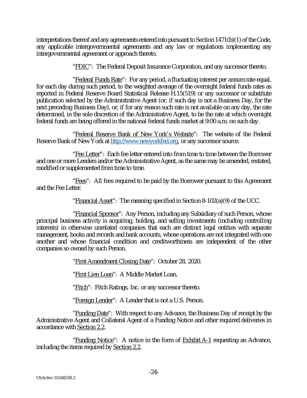 interpretations thereof and any agreements entered into pursuant to Section 1471(b)(1) of the Code, any applicable intergovernmental agreements and any law or regulations implementing any intergovernmental agreement or approach thereto. “FDIC”: The Federal Deposit Insurance Corporation, and any successor thereto. “Federal Funds Rate”: For any period, a fluctuating interest per annum rate equal, for each day during such period, to the weighted average of the overnight federal funds rates as reported in Federal Reserve Board Statistical Release H.15(519) or any successor or substitute publication selected by the Administrative Agent (or, if such day is not a Business Day, for the next preceding Business Day), or, if for any reason such rate is not available on any day, the rate determined, in the sole discretion of the Administrative Agent, to be the rate at which overnight federal funds are being offered in the national federal funds market at 9:00 a.m. on such day. “Federal Reserve Bank of New York’s Website”: The website of the Federal Reserve Bank of New York at http://www.newyorkfed.org, or any successor source. “Fee Letter”: Each fee letter entered into from time to time between the Borrower and one or more Lenders and/or the Administrative Agent, as the same may be amended, restated, modified or supplemented from time to time. “Fees”: All fees required to be paid by the Borrower pursuant to this Agreement and the Fee Letter. “Financial Asset”: The meaning specified in Section 8-102(a)(9) of the UCC. “Financial Sponsor”: Any Person, including any Subsidiary of such Person, whose principal business activity is acquiring, holding, and selling investments (including controlling interests) in otherwise unrelated companies that each are distinct legal entities with separate management, books and records and bank accounts, whose operations are not integrated with one another and whose financial condition and creditworthiness are independent of the other companies so owned by such Person. “First Amendment Closing Date”: October 28, 2020. “First Lien Loan”: A Middle Market Loan. “Fitch”: Fitch Ratings, Inc. or any successor thereto. “Foreign Lender”: A Lender that is not a U.S. Person. “Funding Date”: With respect to any Advance, the Business Day of receipt by the Administrative Agent and Collateral Agent of a Funding Notice and other required deliveries in accordance with Section 2.2. “Funding Notice”: A notice in the form of Exhibit A-1 requesting an Advance, including the items required by Section 2.2. -24- USActive 55348338.2