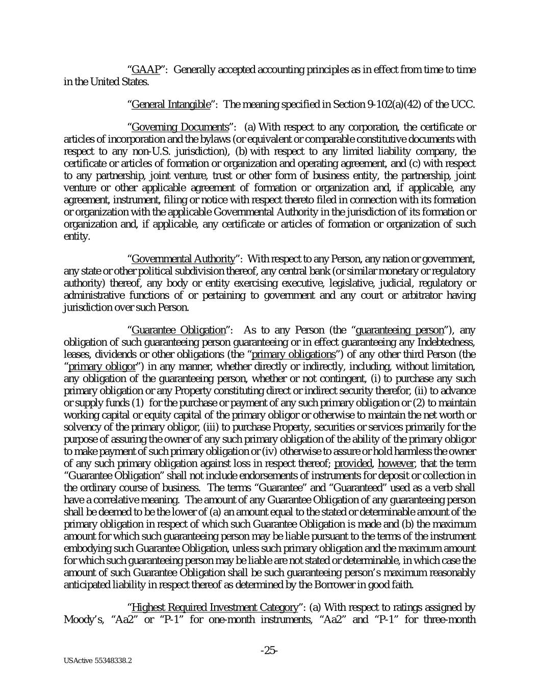 “GAAP”: Generally accepted accounting principles as in effect from time to time in the United States. “General Intangible”: The meaning specified in Section 9-102(a)(42) of the UCC. “Governing Documents”: (a) With respect to any corporation, the certificate or articles of incorporation and the bylaws (or equivalent or comparable constitutive documents with respect to any non-U.S. jurisdiction), (b) with respect to any limited liability company, the certificate or articles of formation or organization and operating agreement, and (c) with respect to any partnership, joint venture, trust or other form of business entity, the partnership, joint venture or other applicable agreement of formation or organization and, if applicable, any agreement, instrument, filing or notice with respect thereto filed in connection with its formation or organization with the applicable Governmental Authority in the jurisdiction of its formation or organization and, if applicable, any certificate or articles of formation or organization of such entity. “Governmental Authority”: With respect to any Person, any nation or government, any state or other political subdivision thereof, any central bank (or similar monetary or regulatory authority) thereof, any body or entity exercising executive, legislative, judicial, regulatory or administrative functions of or pertaining to government and any court or arbitrator having jurisdiction over such Person. “Guarantee Obligation”: As to any Person (the “guaranteeing person”), any obligation of such guaranteeing person guaranteeing or in effect guaranteeing any Indebtedness, leases, dividends or other obligations (the “primary obligations”) of any other third Person (the “primary obligor”) in any manner, whether directly or indirectly, including, without limitation, any obligation of the guaranteeing person, whether or not contingent, (i) to purchase any such primary obligation or any Property constituting direct or indirect security therefor, (ii) to advance or supply funds (1) for the purchase or payment of any such primary obligation or (2) to maintain working capital or equity capital of the primary obligor or otherwise to maintain the net worth or solvency of the primary obligor, (iii) to purchase Property, securities or services primarily for the purpose of assuring the owner of any such primary obligation of the ability of the primary obligor to make payment of such primary obligation or (iv) otherwise to assure or hold harmless the owner of any such primary obligation against loss in respect thereof; provided, however, that the term “Guarantee Obligation” shall not include endorsements of instruments for deposit or collection in the ordinary course of business. The terms “Guarantee” and “Guaranteed” used as a verb shall have a correlative meaning. The amount of any Guarantee Obligation of any guaranteeing person shall be deemed to be the lower of (a) an amount equal to the stated or determinable amount of the primary obligation in respect of which such Guarantee Obligation is made and (b) the maximum amount for which such guaranteeing person may be liable pursuant to the terms of the instrument embodying such Guarantee Obligation, unless such primary obligation and the maximum amount for which such guaranteeing person may be liable are not stated or determinable, in which case the amount of such Guarantee Obligation shall be such guaranteeing person’s maximum reasonably anticipated liability in respect thereof as determined by the Borrower in good faith. “Highest Required Investment Category”: (a) With respect to ratings assigned by Moody’s, “Aa2” or “P-1” for one-month instruments, “Aa2” and “P-1” for three-month -25- USActive 55348338.2