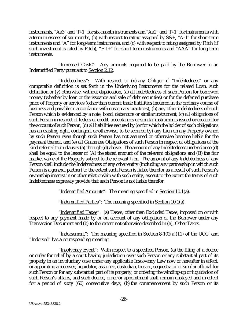 instruments, “Aa3” and “P-1” for six-month instruments and “Aa2” and “P-1” for instruments with a term in excess of six months, (b) with respect to rating assigned by S&P, “A-1” for short-term instruments and “A” for long-term instruments, and (c) with respect to rating assigned by Fitch (if such investment is rated by Fitch), “F-1+” for short-term instruments and “AAA” for long-term instruments. “Increased Costs”: Any amounts required to be paid by the Borrower to an Indemnified Party pursuant to Section 2.12. “Indebtedness”: With respect to (x) any Obligor if “Indebtedness” or any comparable definition is set forth in the Underlying Instruments for the related Loan, such definition or (y) otherwise, without duplication, (a) all indebtedness of such Person for borrowed money (whether by loan or the issuance and sale of debt securities) or for the deferred purchase price of Property or services (other than current trade liabilities incurred in the ordinary course of business and payable in accordance with customary practices), (b) any other indebtedness of such Person which is evidenced by a note, bond, debenture or similar instrument, (c) all obligations of such Person in respect of letters of credit, acceptances or similar instruments issued or created for the account of such Person, (d) all liabilities secured by (or for which the holder of such obligations has an existing right, contingent or otherwise, to be secured by) any Lien on any Property owned by such Person even though such Person has not assumed or otherwise become liable for the payment thereof, and (e) all Guarantee Obligations of such Person in respect of obligations of the kind referred to in clauses (a) through (d) above. The amount of any Indebtedness under clause (d) shall be equal to the lesser of (A) the stated amount of the relevant obligations and (B) the fair market value of the Property subject to the relevant Lien. The amount of any Indebtedness of any Person shall include the Indebtedness of any other entity (including any partnership in which such Person is a general partner) to the extent such Person is liable therefor as a result of such Person’s ownership interest in or other relationship with such entity, except to the extent the terms of such Indebtedness expressly provide that such Person is not liable therefor. “Indemnified Amounts”: The meaning specified in Section 10.1(a). “Indemnified Parties”: The meaning specified in Section 10.1(a). “Indemnified Taxes”: (a) Taxes, other than Excluded Taxes, imposed on or with respect to any payment made by or on account of any obligation of the Borrower under any Transaction Document and (b) to the extent not otherwise described in (a), Other Taxes. “Indorsement”: The meaning specified in Section 8-102(a)(11) of the UCC, and “Indorsed” has a corresponding meaning. “Insolvency Event”: With respect to a specified Person, (a) the filing of a decree or order for relief by a court having jurisdiction over such Person or any substantial part of its property in an involuntary case under any applicable Insolvency Law now or hereafter in effect, or appointing a receiver, liquidator, assignee, custodian, trustee, sequestrator or similar official for such Person or for any substantial part of its property, or ordering the winding-up or liquidation of such Person’s affairs, and such decree, order or appointment shall remain unstayed and in effect for a period of sixty (60) consecutive days, (b) the commencement by such Person or its -26- USActive 55348338.2