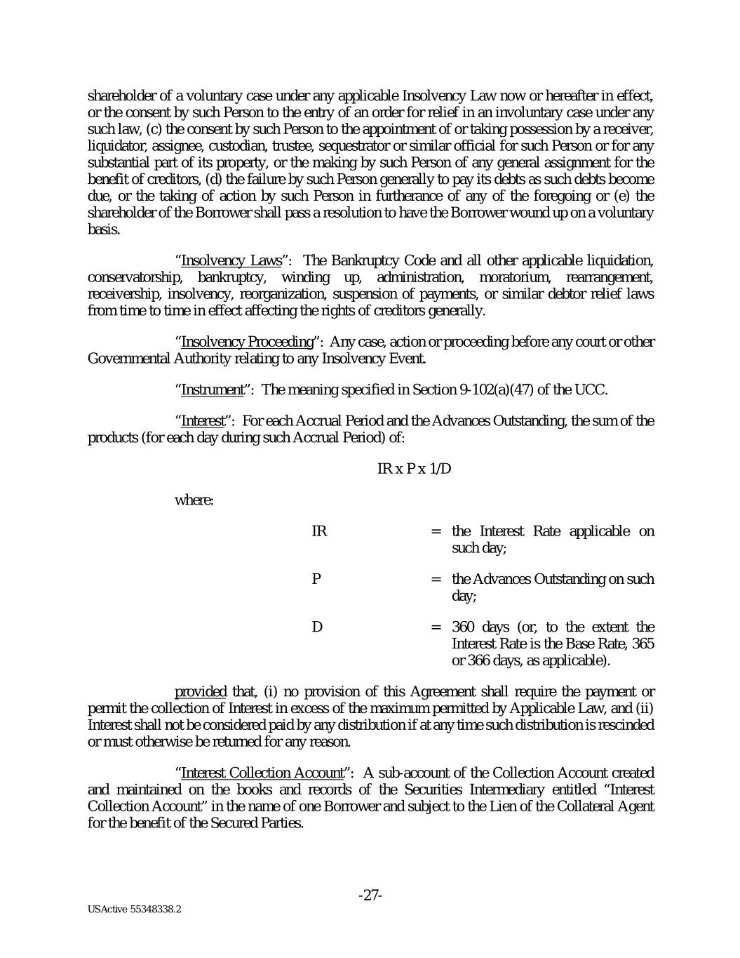 shareholder of a voluntary case under any applicable Insolvency Law now or hereafter in effect, or the consent by such Person to the entry of an order for relief in an involuntary case under any such law, (c) the consent by such Person to the appointment of or taking possession by a receiver, liquidator, assignee, custodian, trustee, sequestrator or similar official for such Person or for any substantial part of its property, or the making by such Person of any general assignment for the benefit of creditors, (d) the failure by such Person generally to pay its debts as such debts become due, or the taking of action by such Person in furtherance of any of the foregoing or (e) the shareholder of the Borrower shall pass a resolution to have the Borrower wound up on a voluntary basis. “Insolvency Laws”: The Bankruptcy Code and all other applicable liquidation, conservatorship, bankruptcy, winding up, administration, moratorium, rearrangement, receivership, insolvency, reorganization, suspension of payments, or similar debtor relief laws from time to time in effect affecting the rights of creditors generally. “Insolvency Proceeding”: Any case, action or proceeding before any court or other Governmental Authority relating to any Insolvency Event. “Instrument”: The meaning specified in Section 9-102(a)(47) of the UCC. “Interest”: For each Accrual Period and the Advances Outstanding, the sum of the products (for each day during such Accrual Period) of: IR x P x 1/D where: IR = the Interest Rate applicable on such day; P = the Advances Outstanding on such day; D = 360 days (or, to the extent the Interest Rate is the Base Rate, 365 or 366 days, as applicable). provided that, (i) no provision of this Agreement shall require the payment or permit the collection of Interest in excess of the maximum permitted by Applicable Law, and (ii) Interest shall not be considered paid by any distribution if at any time such distribution is rescinded or must otherwise be returned for any reason. “Interest Collection Account”: A sub-account of the Collection Account created and maintained on the books and records of the Securities Intermediary entitled “Interest Collection Account” in the name of one Borrower and subject to the Lien of the Collateral Agent for the benefit of the Secured Parties. -27- USActive 55348338.2