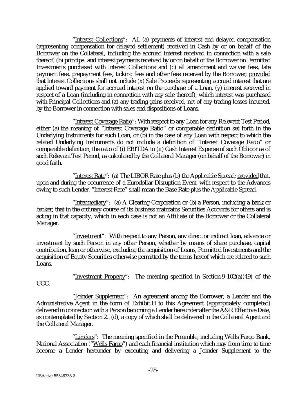 “Interest Collections”: All (a) payments of interest and delayed compensation (representing compensation for delayed settlement) received in Cash by or on behalf of the Borrower on the Collateral, including the accrued interest received in connection with a sale thereof, (b) principal and interest payments received by or on behalf of the Borrower on Permitted Investments purchased with Interest Collections and (c) all amendment and waiver fees, late payment fees, prepayment fees, ticking fees and other fees received by the Borrower; provided that Interest Collections shall not include (x) Sale Proceeds representing accrued interest that are applied toward payment for accrued interest on the purchase of a Loan, (y) interest received in respect of a Loan (including in connection with any sale thereof), which interest was purchased with Principal Collections and (z) any trading gains received, net of any trading losses incurred, by the Borrower in connection with sales and dispositions of Loans. “Interest Coverage Ratio”: With respect to any Loan for any Relevant Test Period, either (a) the meaning of “Interest Coverage Ratio” or comparable definition set forth in the Underlying Instruments for such Loan, or (b) in the case of any Loan with respect to which the related Underlying Instruments do not include a definition of “Interest Coverage Ratio” or comparable definition, the ratio of (i) EBITDA to (ii) Cash Interest Expense of such Obligor as of such Relevant Test Period, as calculated by the Collateral Manager (on behalf of the Borrower) in good faith. “Interest Rate”: (a) The LIBOR Rate plus (b) the Applicable Spread; provided that, upon and during the occurrence of a Eurodollar Disruption Event, with respect to the Advances owing to such Lender, “Interest Rate” shall mean the Base Rate plus the Applicable Spread. “Intermediary”: (a) A Clearing Corporation or (b) a Person, including a bank or broker, that in the ordinary course of its business maintains Securities Accounts for others and is acting in that capacity, which in each case is not an Affiliate of the Borrower or the Collateral Manager. “Investment”: With respect to any Person, any direct or indirect loan, advance or investment by such Person in any other Person, whether by means of share purchase, capital contribution, loan or otherwise, excluding the acquisition of Loans, Permitted Investments and the acquisition of Equity Securities otherwise permitted by the terms hereof which are related to such Loans. “Investment Property”: The meaning specified in Section 9-102(a)(49) of the UCC. “Joinder Supplement”: An agreement among the Borrower, a Lender and the Administrative Agent in the form of Exhibit H to this Agreement (appropriately completed) delivered in connection with a Person becoming a Lender hereunder after the A&R Effective Date, as contemplated by Section 2.1(d), a copy of which shall be delivered to the Collateral Agent and the Collateral Manager. “Lenders”: The meaning specified in the Preamble, including Wells Fargo Bank, National Association (“Wells Fargo”) and each financial institution which may from time to time become a Lender hereunder by executing and delivering a Joinder Supplement to the -28- USActive 55348338.2
