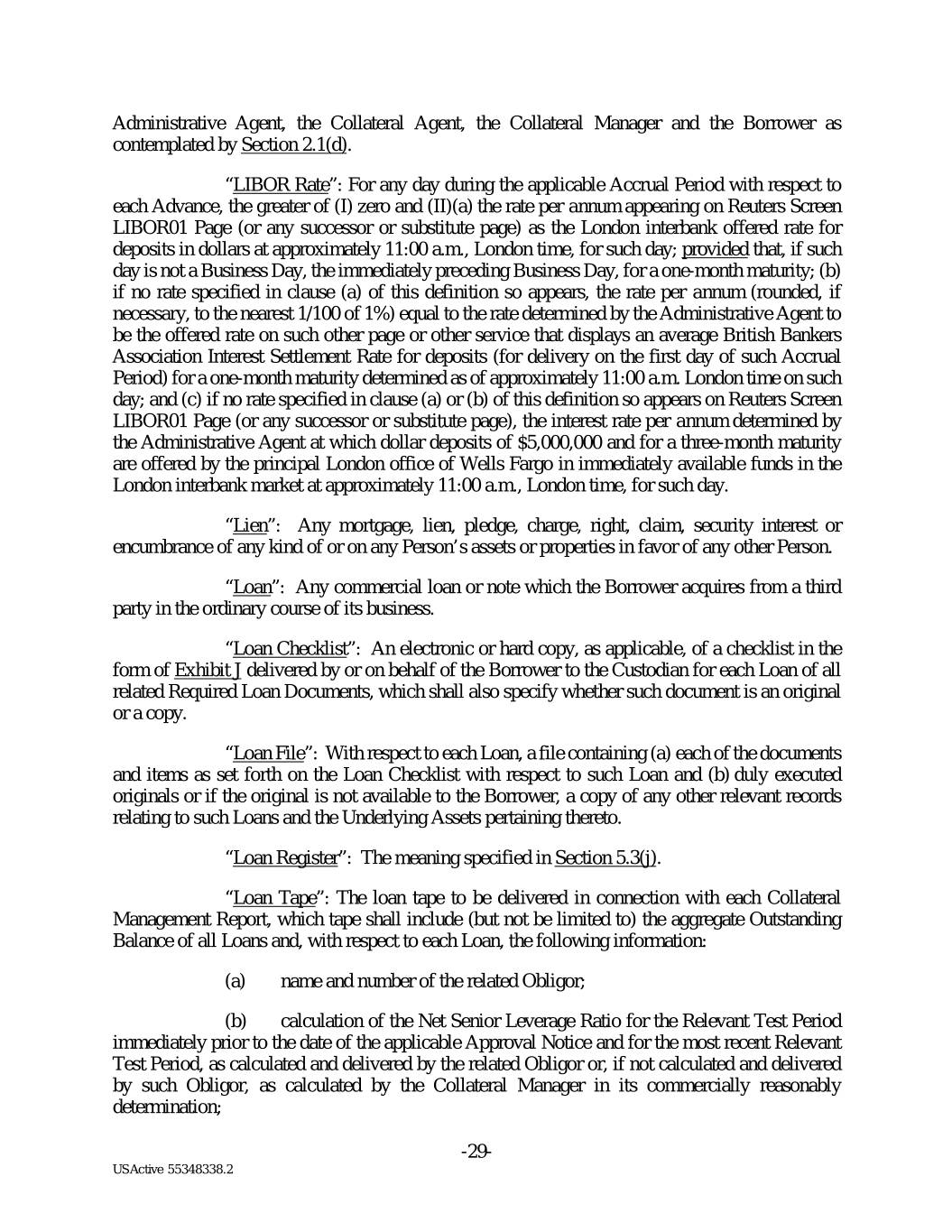 Administrative Agent, the Collateral Agent, the Collateral Manager and the Borrower as contemplated by Section 2.1(d). “LIBOR Rate”: For any day during the applicable Accrual Period with respect to each Advance, the greater of (I) zero and (II)(a) the rate per annum appearing on Reuters Screen LIBOR01 Page (or any successor or substitute page) as the London interbank offered rate for deposits in dollars at approximately 11:00 a.m., London time, for such day; provided that, if such day is not a Business Day, the immediately preceding Business Day, for a one-month maturity; (b) if no rate specified in clause (a) of this definition so appears, the rate per annum (rounded, if necessary, to the nearest 1/100 of 1%) equal to the rate determined by the Administrative Agent to be the offered rate on such other page or other service that displays an average British Bankers Association Interest Settlement Rate for deposits (for delivery on the first day of such Accrual Period) for a one-month maturity determined as of approximately 11:00 a.m. London time on such day; and (c) if no rate specified in clause (a) or (b) of this definition so appears on Reuters Screen LIBOR01 Page (or any successor or substitute page), the interest rate per annum determined by the Administrative Agent at which dollar deposits of $5,000,000 and for a three-month maturity are offered by the principal London office of Wells Fargo in immediately available funds in the London interbank market at approximately 11:00 a.m., London time, for such day. “Lien”: Any mortgage, lien, pledge, charge, right, claim, security interest or encumbrance of any kind of or on any Person’s assets or properties in favor of any other Person. “Loan”: Any commercial loan or note which the Borrower acquires from a third party in the ordinary course of its business. “Loan Checklist”: An electronic or hard copy, as applicable, of a checklist in the form of Exhibit J delivered by or on behalf of the Borrower to the Custodian for each Loan of all related Required Loan Documents, which shall also specify whether such document is an original or a copy. “Loan File”: With respect to each Loan, a file containing (a) each of the documents and items as set forth on the Loan Checklist with respect to such Loan and (b) duly executed originals or if the original is not available to the Borrower, a copy of any other relevant records relating to such Loans and the Underlying Assets pertaining thereto. “Loan Register”: The meaning specified in Section 5.3(j). “Loan Tape”: The loan tape to be delivered in connection with each Collateral Management Report, which tape shall include (but not be limited to) the aggregate Outstanding Balance of all Loans and, with respect to each Loan, the following information: (a) name and number of the related Obligor; (b) calculation of the Net Senior Leverage Ratio for the Relevant Test Period immediately prior to the date of the applicable Approval Notice and for the most recent Relevant Test Period, as calculated and delivered by the related Obligor or, if not calculated and delivered by such Obligor, as calculated by the Collateral Manager in its commercially reasonably determination; -29- USActive 55348338.2