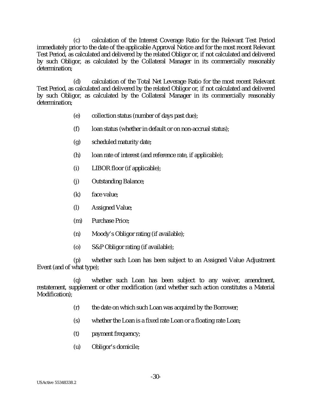(c) calculation of the Interest Coverage Ratio for the Relevant Test Period immediately prior to the date of the applicable Approval Notice and for the most recent Relevant Test Period, as calculated and delivered by the related Obligor or, if not calculated and delivered by such Obligor, as calculated by the Collateral Manager in its commercially reasonably determination; (d) calculation of the Total Net Leverage Ratio for the most recent Relevant Test Period, as calculated and delivered by the related Obligor or, if not calculated and delivered by such Obligor, as calculated by the Collateral Manager in its commercially reasonably determination; (e) collection status (number of days past due); (f) loan status (whether in default or on non-accrual status); (g) scheduled maturity date; (h) loan rate of interest (and reference rate, if applicable); (i) LIBOR floor (if applicable); (j) Outstanding Balance; (k) face value; (l) Assigned Value; (m) Purchase Price; (n) Moody’s Obligor rating (if available); (o) S&P Obligor rating (if available); (p) whether such Loan has been subject to an Assigned Value Adjustment Event (and of what type); (q) whether such Loan has been subject to any waiver, amendment, restatement, supplement or other modification (and whether such action constitutes a Material Modification); (r) the date on which such Loan was acquired by the Borrower; (s) whether the Loan is a fixed rate Loan or a floating rate Loan; (t) payment frequency; (u) Obligor’s domicile; -30- USActive 55348338.2