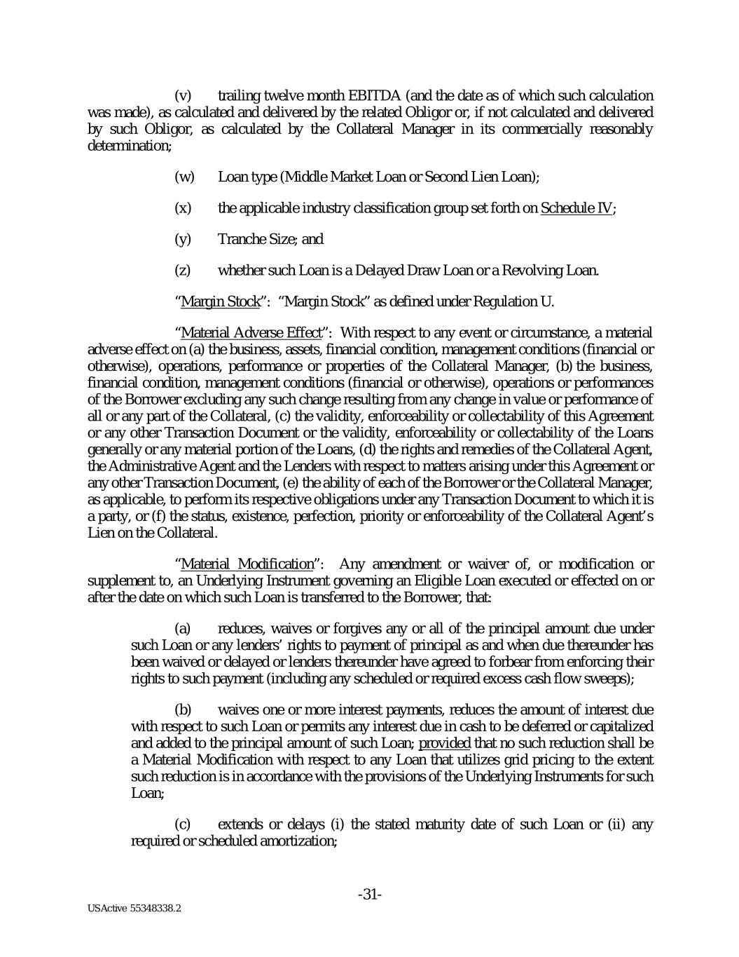 (v) trailing twelve month EBITDA (and the date as of which such calculation was made), as calculated and delivered by the related Obligor or, if not calculated and delivered by such Obligor, as calculated by the Collateral Manager in its commercially reasonably determination; (w) Loan type (Middle Market Loan or Second Lien Loan); (x) the applicable industry classification group set forth on Schedule IV; (y) Tranche Size; and (z) whether such Loan is a Delayed Draw Loan or a Revolving Loan. “Margin Stock”: “Margin Stock” as defined under Regulation U. “Material Adverse Effect”: With respect to any event or circumstance, a material adverse effect on (a) the business, assets, financial condition, management conditions (financial or otherwise), operations, performance or properties of the Collateral Manager, (b) the business, financial condition, management conditions (financial or otherwise), operations or performances of the Borrower excluding any such change resulting from any change in value or performance of all or any part of the Collateral, (c) the validity, enforceability or collectability of this Agreement or any other Transaction Document or the validity, enforceability or collectability of the Loans generally or any material portion of the Loans, (d) the rights and remedies of the Collateral Agent, the Administrative Agent and the Lenders with respect to matters arising under this Agreement or any other Transaction Document, (e) the ability of each of the Borrower or the Collateral Manager, as applicable, to perform its respective obligations under any Transaction Document to which it is a party, or (f) the status, existence, perfection, priority or enforceability of the Collateral Agent’s Lien on the Collateral. “Material Modification”: Any amendment or waiver of, or modification or supplement to, an Underlying Instrument governing an Eligible Loan executed or effected on or after the date on which such Loan is transferred to the Borrower, that: (a) reduces, waives or forgives any or all of the principal amount due under such Loan or any lenders’ rights to payment of principal as and when due thereunder has been waived or delayed or lenders thereunder have agreed to forbear from enforcing their rights to such payment (including any scheduled or required excess cash flow sweeps); (b) waives one or more interest payments, reduces the amount of interest due with respect to such Loan or permits any interest due in cash to be deferred or capitalized and added to the principal amount of such Loan; provided that no such reduction shall be a Material Modification with respect to any Loan that utilizes grid pricing to the extent such reduction is in accordance with the provisions of the Underlying Instruments for such Loan; (c) extends or delays (i) the stated maturity date of such Loan or (ii) any required or scheduled amortization; -31- USActive 55348338.2