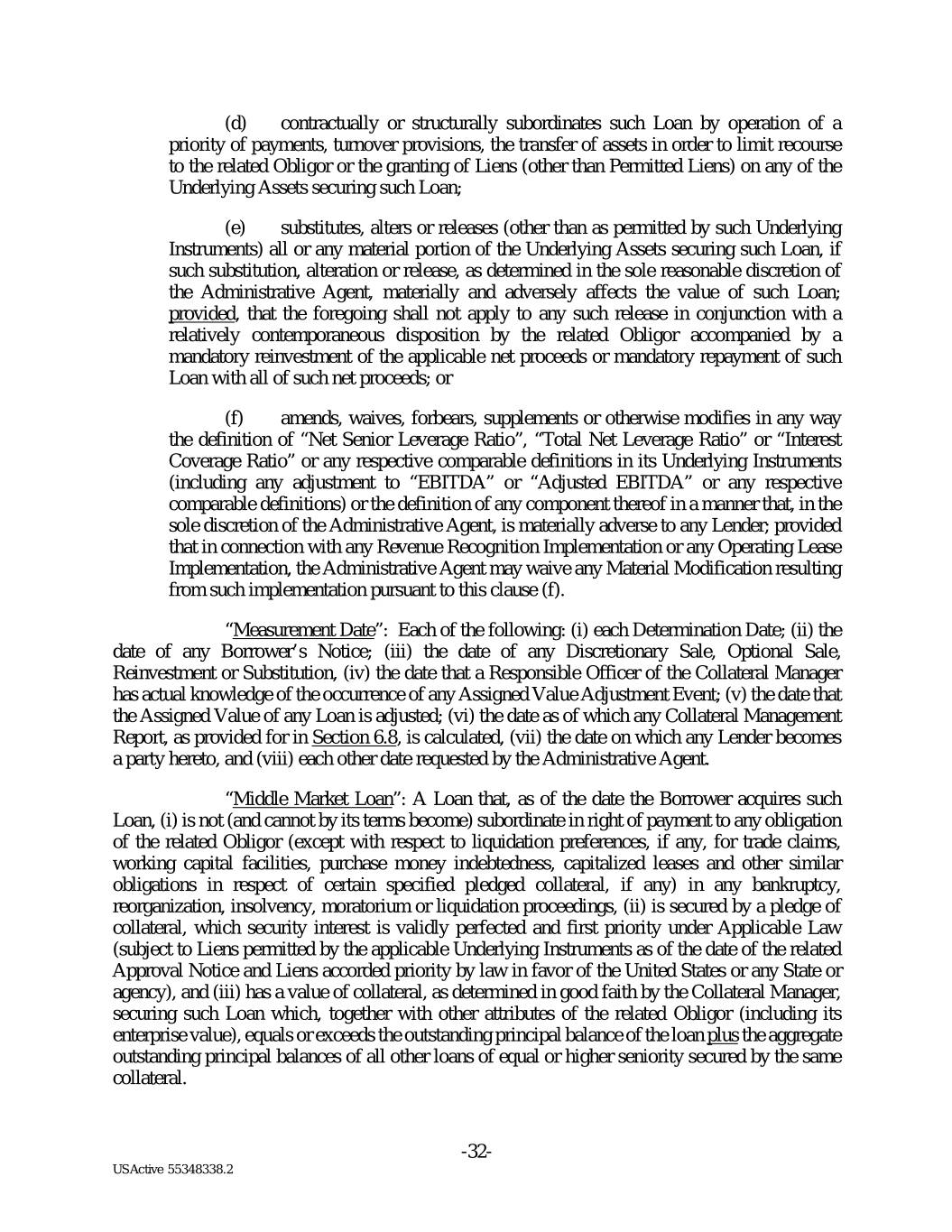 (d) contractually or structurally subordinates such Loan by operation of a priority of payments, turnover provisions, the transfer of assets in order to limit recourse to the related Obligor or the granting of Liens (other than Permitted Liens) on any of the Underlying Assets securing such Loan; (e) substitutes, alters or releases (other than as permitted by such Underlying Instruments) all or any material portion of the Underlying Assets securing such Loan, if such substitution, alteration or release, as determined in the sole reasonable discretion of the Administrative Agent, materially and adversely affects the value of such Loan; provided, that the foregoing shall not apply to any such release in conjunction with a relatively contemporaneous disposition by the related Obligor accompanied by a mandatory reinvestment of the applicable net proceeds or mandatory repayment of such Loan with all of such net proceeds; or (f) amends, waives, forbears, supplements or otherwise modifies in any way the definition of “Net Senior Leverage Ratio”, “Total Net Leverage Ratio” or “Interest Coverage Ratio” or any respective comparable definitions in its Underlying Instruments (including any adjustment to “EBITDA” or “Adjusted EBITDA” or any respective comparable definitions) or the definition of any component thereof in a manner that, in the sole discretion of the Administrative Agent, is materially adverse to any Lender; provided that in connection with any Revenue Recognition Implementation or any Operating Lease Implementation, the Administrative Agent may waive any Material Modification resulting from such implementation pursuant to this clause (f). “Measurement Date”: Each of the following: (i) each Determination Date; (ii) the date of any Borrower’s Notice; (iii) the date of any Discretionary Sale, Optional Sale, Reinvestment or Substitution, (iv) the date that a Responsible Officer of the Collateral Manager has actual knowledge of the occurrence of any Assigned Value Adjustment Event; (v) the date that the Assigned Value of any Loan is adjusted; (vi) the date as of which any Collateral Management Report, as provided for in Section 6.8, is calculated, (vii) the date on which any Lender becomes a party hereto, and (viii) each other date requested by the Administrative Agent. “Middle Market Loan”: A Loan that, as of the date the Borrower acquires such Loan, (i) is not (and cannot by its terms become) subordinate in right of payment to any obligation of the related Obligor (except with respect to liquidation preferences, if any, for trade claims, working capital facilities, purchase money indebtedness, capitalized leases and other similar obligations in respect of certain specified pledged collateral, if any) in any bankruptcy, reorganization, insolvency, moratorium or liquidation proceedings, (ii) is secured by a pledge of collateral, which security interest is validly perfected and first priority under Applicable Law (subject to Liens permitted by the applicable Underlying Instruments as of the date of the related Approval Notice and Liens accorded priority by law in favor of the United States or any State or agency), and (iii) has a value of collateral, as determined in good faith by the Collateral Manager, securing such Loan which, together with other attributes of the related Obligor (including its enterprise value), equals or exceeds the outstanding principal balance of the loan plus the aggregate outstanding principal balances of all other loans of equal or higher seniority secured by the same collateral. -32- USActive 55348338.2
