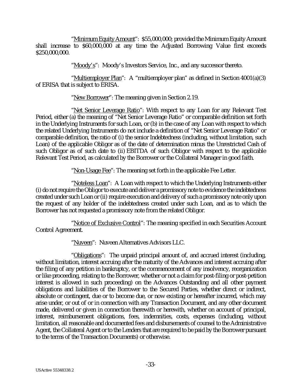 “Minimum Equity Amount”: $55,000,000; provided the Minimum Equity Amount shall increase to $60,000,000 at any time the Adjusted Borrowing Value first exceeds $250,000,000. “Moody’s”: Moody’s Investors Service, Inc., and any successor thereto. “Multiemployer Plan”: A “multiemployer plan” as defined in Section 4001(a)(3) of ERISA that is subject to ERISA. “New Borrower”: The meaning given in Section 2.19. “Net Senior Leverage Ratio”: With respect to any Loan for any Relevant Test Period, either (a) the meaning of “Net Senior Leverage Ratio” or comparable definition set forth in the Underlying Instruments for such Loan, or (b) in the case of any Loan with respect to which the related Underlying Instruments do not include a definition of “Net Senior Leverage Ratio” or comparable definition, the ratio of (i) the senior Indebtedness (including, without limitation, such Loan) of the applicable Obligor as of the date of determination minus the Unrestricted Cash of such Obligor as of such date to (ii) EBITDA of such Obligor with respect to the applicable Relevant Test Period, as calculated by the Borrower or the Collateral Manager in good faith. “Non-Usage Fee”: The meaning set forth in the applicable Fee Letter. “Noteless Loan”: A Loan with respect to which the Underlying Instruments either (i) do not require the Obligor to execute and deliver a promissory note to evidence the indebtedness created under such Loan or (ii) require execution and delivery of such a promissory note only upon the request of any holder of the indebtedness created under such Loan, and as to which the Borrower has not requested a promissory note from the related Obligor. “Notice of Exclusive Control”: The meaning specified in each Securities Account Control Agreement. “Nuveen”: Nuveen Alternatives Advisors LLC. “Obligations”: The unpaid principal amount of, and accrued interest (including, without limitation, interest accruing after the maturity of the Advances and interest accruing after the filing of any petition in bankruptcy, or the commencement of any insolvency, reorganization or like proceeding, relating to the Borrower, whether or not a claim for post-filing or post-petition interest is allowed in such proceeding) on the Advances Outstanding and all other payment obligations and liabilities of the Borrower to the Secured Parties, whether direct or indirect, absolute or contingent, due or to become due, or now existing or hereafter incurred, which may arise under, or out of or in connection with any Transaction Document, and any other document made, delivered or given in connection therewith or herewith, whether on account of principal, interest, reimbursement obligations, fees, indemnities, costs, expenses (including, without limitation, all reasonable and documented fees and disbursements of counsel to the Administrative Agent, the Collateral Agent or to the Lenders that are required to be paid by the Borrower pursuant to the terms of the Transaction Documents) or otherwise. -33- USActive 55348338.2