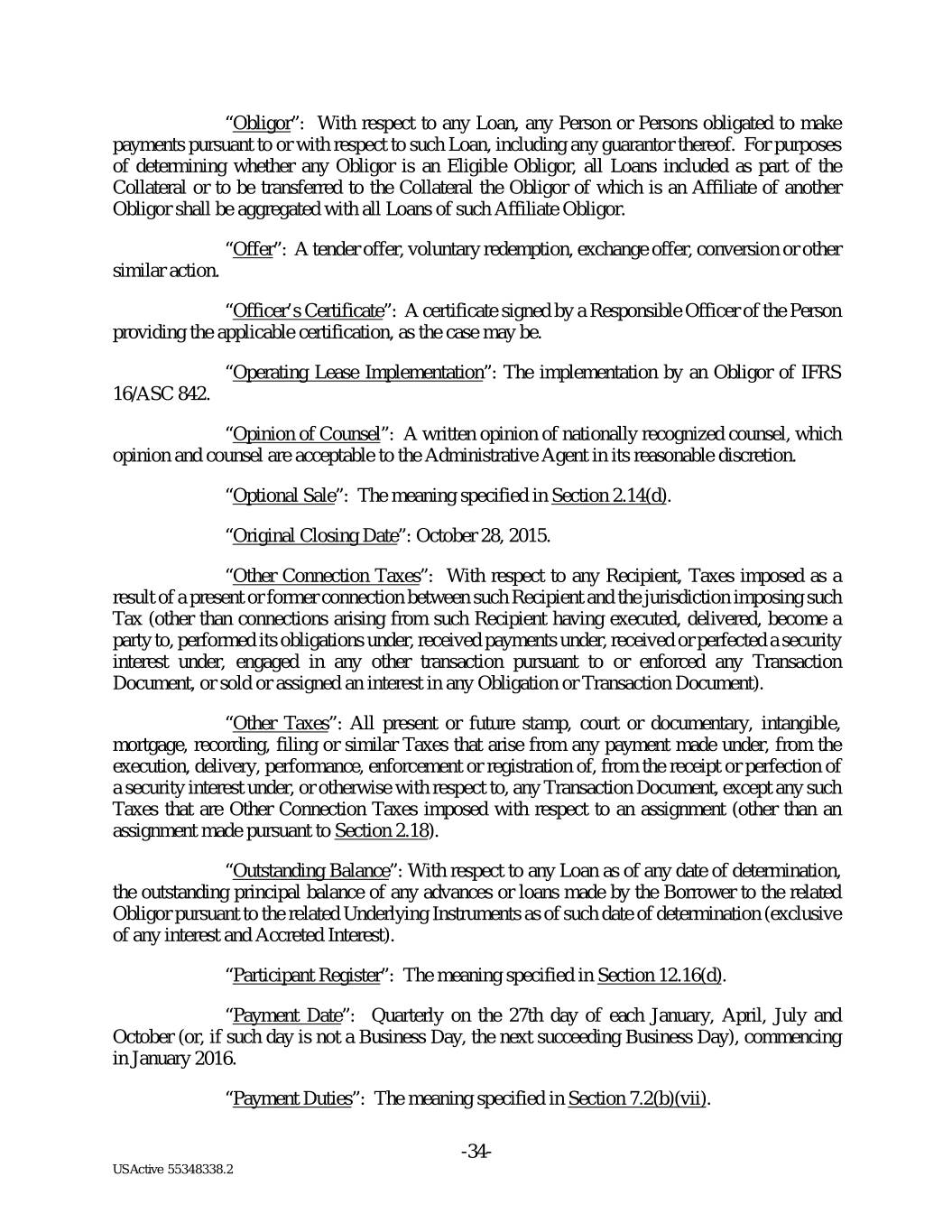 “Obligor”: With respect to any Loan, any Person or Persons obligated to make payments pursuant to or with respect to such Loan, including any guarantor thereof. For purposes of determining whether any Obligor is an Eligible Obligor, all Loans included as part of the Collateral or to be transferred to the Collateral the Obligor of which is an Affiliate of another Obligor shall be aggregated with all Loans of such Affiliate Obligor. “Offer”: A tender offer, voluntary redemption, exchange offer, conversion or other similar action. “Officer’s Certificate”: A certificate signed by a Responsible Officer of the Person providing the applicable certification, as the case may be. “Operating Lease Implementation”: The implementation by an Obligor of IFRS 16/ASC 842. “Opinion of Counsel”: A written opinion of nationally recognized counsel, which opinion and counsel are acceptable to the Administrative Agent in its reasonable discretion. “Optional Sale”: The meaning specified in Section 2.14(d). “Original Closing Date”: October 28, 2015. “Other Connection Taxes”: With respect to any Recipient, Taxes imposed as a result of a present or former connection between such Recipient and the jurisdiction imposing such Tax (other than connections arising from such Recipient having executed, delivered, become a party to, performed its obligations under, received payments under, received or perfected a security interest under, engaged in any other transaction pursuant to or enforced any Transaction Document, or sold or assigned an interest in any Obligation or Transaction Document). “Other Taxes”: All present or future stamp, court or documentary, intangible, mortgage, recording, filing or similar Taxes that arise from any payment made under, from the execution, delivery, performance, enforcement or registration of, from the receipt or perfection of a security interest under, or otherwise with respect to, any Transaction Document, except any such Taxes that are Other Connection Taxes imposed with respect to an assignment (other than an assignment made pursuant to Section 2.18). “Outstanding Balance”: With respect to any Loan as of any date of determination, the outstanding principal balance of any advances or loans made by the Borrower to the related Obligor pursuant to the related Underlying Instruments as of such date of determination (exclusive of any interest and Accreted Interest). “Participant Register”: The meaning specified in Section 12.16(d). “Payment Date”: Quarterly on the 27th day of each January, April, July and October (or, if such day is not a Business Day, the next succeeding Business Day), commencing in January 2016. “Payment Duties”: The meaning specified in Section 7.2(b)(vii). -34- USActive 55348338.2