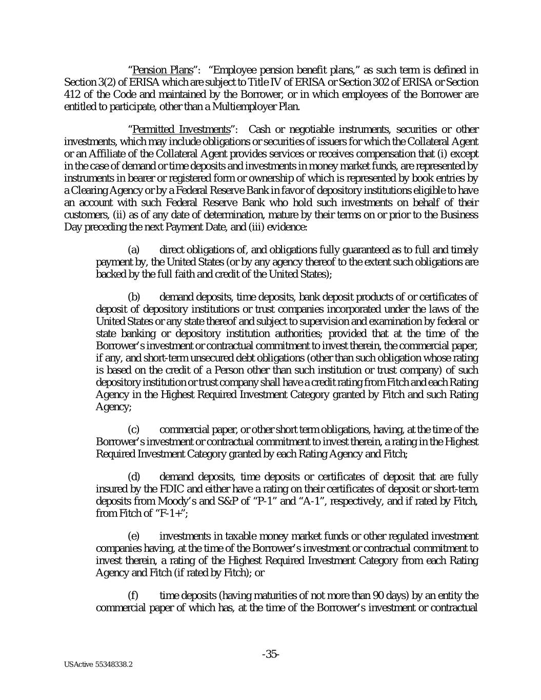 “Pension Plans”: “Employee pension benefit plans,” as such term is defined in Section 3(2) of ERISA which are subject to Title IV of ERISA or Section 302 of ERISA or Section 412 of the Code and maintained by the Borrower, or in which employees of the Borrower are entitled to participate, other than a Multiemployer Plan. “Permitted Investments”: Cash or negotiable instruments, securities or other investments, which may include obligations or securities of issuers for which the Collateral Agent or an Affiliate of the Collateral Agent provides services or receives compensation that (i) except in the case of demand or time deposits and investments in money market funds, are represented by instruments in bearer or registered form or ownership of which is represented by book entries by a Clearing Agency or by a Federal Reserve Bank in favor of depository institutions eligible to have an account with such Federal Reserve Bank who hold such investments on behalf of their customers, (ii) as of any date of determination, mature by their terms on or prior to the Business Day preceding the next Payment Date, and (iii) evidence: (a) direct obligations of, and obligations fully guaranteed as to full and timely payment by, the United States (or by any agency thereof to the extent such obligations are backed by the full faith and credit of the United States); (b) demand deposits, time deposits, bank deposit products of or certificates of deposit of depository institutions or trust companies incorporated under the laws of the United States or any state thereof and subject to supervision and examination by federal or state banking or depository institution authorities; provided that at the time of the Borrower’s investment or contractual commitment to invest therein, the commercial paper, if any, and short-term unsecured debt obligations (other than such obligation whose rating is based on the credit of a Person other than such institution or trust company) of such depository institution or trust company shall have a credit rating from Fitch and each Rating Agency in the Highest Required Investment Category granted by Fitch and such Rating Agency; (c) commercial paper, or other short term obligations, having, at the time of the Borrower’s investment or contractual commitment to invest therein, a rating in the Highest Required Investment Category granted by each Rating Agency and Fitch; (d) demand deposits, time deposits or certificates of deposit that are fully insured by the FDIC and either have a rating on their certificates of deposit or short-term deposits from Moody’s and S&P of “P-1” and “A-1”, respectively, and if rated by Fitch, from Fitch of “F-1+”; (e) investments in taxable money market funds or other regulated investment companies having, at the time of the Borrower’s investment or contractual commitment to invest therein, a rating of the Highest Required Investment Category from each Rating Agency and Fitch (if rated by Fitch); or (f) time deposits (having maturities of not more than 90 days) by an entity the commercial paper of which has, at the time of the Borrower’s investment or contractual -35- USActive 55348338.2