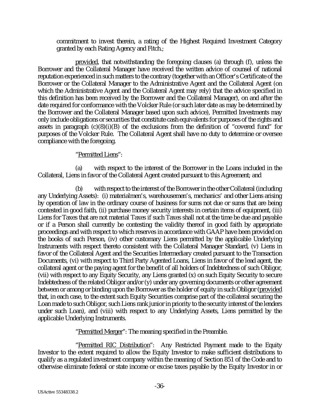 commitment to invest therein, a rating of the Highest Required Investment Category granted by each Rating Agency and Fitch.; provided, that notwithstanding the foregoing clauses (a) through (f), unless the Borrower and the Collateral Manager have received the written advice of counsel of national reputation experienced in such matters to the contrary (together with an Officer’s Certificate of the Borrower or the Collateral Manager to the Administrative Agent and the Collateral Agent (on which the Administrative Agent and the Collateral Agent may rely) that the advice specified in this definition has been received by the Borrower and the Collateral Manager), on and after the date required for conformance with the Volcker Rule (or such later date as may be determined by the Borrower and the Collateral Manager based upon such advice), Permitted Investments may only include obligations or securities that constitute cash equivalents for purposes of the rights and assets in paragraph (c)(8)(i)(B) of the exclusions from the definition of “covered fund” for purposes of the Volcker Rule. The Collateral Agent shall have no duty to determine or oversee compliance with the foregoing. “Permitted Liens”: (a) with respect to the interest of the Borrower in the Loans included in the Collateral, Liens in favor of the Collateral Agent created pursuant to this Agreement; and (b) with respect to the interest of the Borrower in the other Collateral (including any Underlying Assets): (i) materialmen’s, warehousemen’s, mechanics’ and other Liens arising by operation of law in the ordinary course of business for sums not due or sums that are being contested in good faith, (ii) purchase money security interests in certain items of equipment, (iii) Liens for Taxes that are not material Taxes if such Taxes shall not at the time be due and payable or if a Person shall currently be contesting the validity thereof in good faith by appropriate proceedings and with respect to which reserves in accordance with GAAP have been provided on the books of such Person, (iv) other customary Liens permitted by the applicable Underlying Instruments with respect thereto consistent with the Collateral Manager Standard, (v) Liens in favor of the Collateral Agent and the Securities Intermediary created pursuant to the Transaction Documents, (vi) with respect to Third Party Agented Loans, Liens in favor of the lead agent, the collateral agent or the paying agent for the benefit of all holders of Indebtedness of such Obligor, (vii) with respect to any Equity Security, any Liens granted (x) on such Equity Security to secure Indebtedness of the related Obligor and/or (y) under any governing documents or other agreement between or among or binding upon the Borrower as the holder of equity in such Obligor (provided that, in each case, to the extent such Equity Securities comprise part of the collateral securing the Loan made to such Obligor, such Liens rank junior in priority to the security interest of the lenders under such Loan), and (viii) with respect to any Underlying Assets, Liens permitted by the applicable Underlying Instruments. “Permitted Merger”: The meaning specified in the Preamble. “Permitted RIC Distribution”: Any Restricted Payment made to the Equity Investor to the extent required to allow the Equity Investor to make sufficient distributions to qualify as a regulated investment company within the meaning of Section 851 of the Code and to otherwise eliminate federal or state income or excise taxes payable by the Equity Investor in or -36- USActive 55348338.2