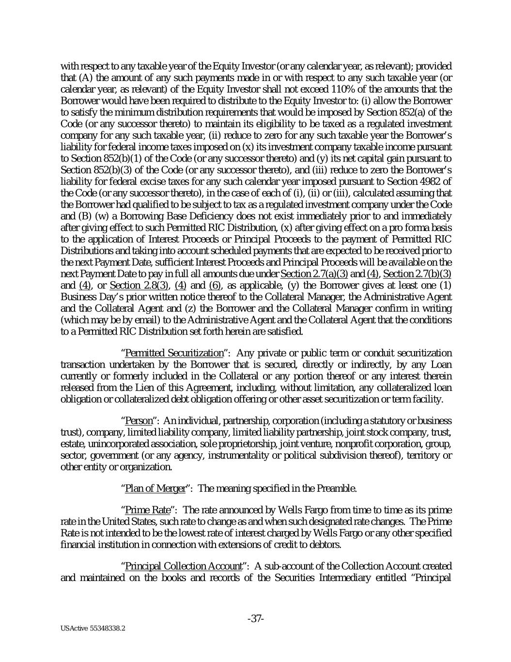 with respect to any taxable year of the Equity Investor (or any calendar year, as relevant); provided that (A) the amount of any such payments made in or with respect to any such taxable year (or calendar year, as relevant) of the Equity Investor shall not exceed 110% of the amounts that the Borrower would have been required to distribute to the Equity Investor to: (i) allow the Borrower to satisfy the minimum distribution requirements that would be imposed by Section 852(a) of the Code (or any successor thereto) to maintain its eligibility to be taxed as a regulated investment company for any such taxable year, (ii) reduce to zero for any such taxable year the Borrower’s liability for federal income taxes imposed on (x) its investment company taxable income pursuant to Section 852(b)(1) of the Code (or any successor thereto) and (y) its net capital gain pursuant to Section 852(b)(3) of the Code (or any successor thereto), and (iii) reduce to zero the Borrower’s liability for federal excise taxes for any such calendar year imposed pursuant to Section 4982 of the Code (or any successor thereto), in the case of each of (i), (ii) or (iii), calculated assuming that the Borrower had qualified to be subject to tax as a regulated investment company under the Code and (B) (w) a Borrowing Base Deficiency does not exist immediately prior to and immediately after giving effect to such Permitted RIC Distribution, (x) after giving effect on a pro forma basis to the application of Interest Proceeds or Principal Proceeds to the payment of Permitted RIC Distributions and taking into account scheduled payments that are expected to be received prior to the next Payment Date, sufficient Interest Proceeds and Principal Proceeds will be available on the next Payment Date to pay in full all amounts due under Section 2.7(a)(3) and (4), Section 2.7(b)(3) and (4), or Section 2.8(3), (4) and (6), as applicable, (y) the Borrower gives at least one (1) Business Day’s prior written notice thereof to the Collateral Manager, the Administrative Agent and the Collateral Agent and (z) the Borrower and the Collateral Manager confirm in writing (which may be by email) to the Administrative Agent and the Collateral Agent that the conditions to a Permitted RIC Distribution set forth herein are satisfied. “Permitted Securitization”: Any private or public term or conduit securitization transaction undertaken by the Borrower that is secured, directly or indirectly, by any Loan currently or formerly included in the Collateral or any portion thereof or any interest therein released from the Lien of this Agreement, including, without limitation, any collateralized loan obligation or collateralized debt obligation offering or other asset securitization or term facility. “Person”: An individual, partnership, corporation (including a statutory or business trust), company, limited liability company, limited liability partnership, joint stock company, trust, estate, unincorporated association, sole proprietorship, joint venture, nonprofit corporation, group, sector, government (or any agency, instrumentality or political subdivision thereof), territory or other entity or organization. “Plan of Merger”: The meaning specified in the Preamble. “Prime Rate”: The rate announced by Wells Fargo from time to time as its prime rate in the United States, such rate to change as and when such designated rate changes. The Prime Rate is not intended to be the lowest rate of interest charged by Wells Fargo or any other specified financial institution in connection with extensions of credit to debtors. “Principal Collection Account”: A sub-account of the Collection Account created and maintained on the books and records of the Securities Intermediary entitled “Principal -37- USActive 55348338.2
