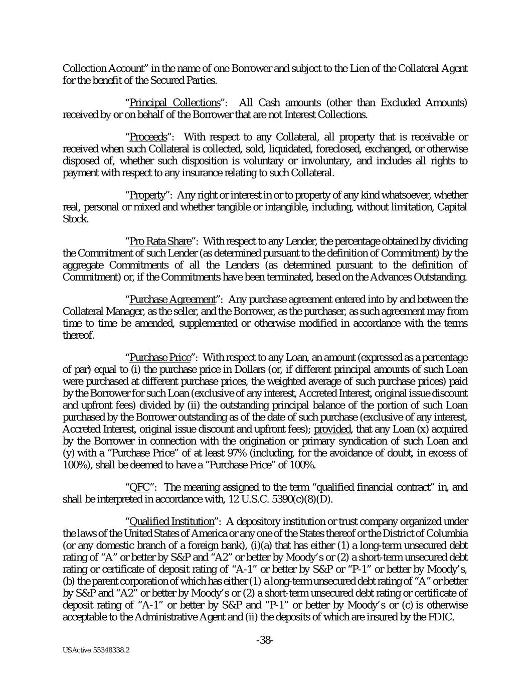 Collection Account” in the name of one Borrower and subject to the Lien of the Collateral Agent for the benefit of the Secured Parties. “Principal Collections”: All Cash amounts (other than Excluded Amounts) received by or on behalf of the Borrower that are not Interest Collections. “Proceeds”: With respect to any Collateral, all property that is receivable or received when such Collateral is collected, sold, liquidated, foreclosed, exchanged, or otherwise disposed of, whether such disposition is voluntary or involuntary, and includes all rights to payment with respect to any insurance relating to such Collateral. “Property”: Any right or interest in or to property of any kind whatsoever, whether real, personal or mixed and whether tangible or intangible, including, without limitation, Capital Stock. “Pro Rata Share”: With respect to any Lender, the percentage obtained by dividing the Commitment of such Lender (as determined pursuant to the definition of Commitment) by the aggregate Commitments of all the Lenders (as determined pursuant to the definition of Commitment) or, if the Commitments have been terminated, based on the Advances Outstanding. “Purchase Agreement”: Any purchase agreement entered into by and between the Collateral Manager, as the seller, and the Borrower, as the purchaser, as such agreement may from time to time be amended, supplemented or otherwise modified in accordance with the terms thereof. “Purchase Price”: With respect to any Loan, an amount (expressed as a percentage of par) equal to (i) the purchase price in Dollars (or, if different principal amounts of such Loan were purchased at different purchase prices, the weighted average of such purchase prices) paid by the Borrower for such Loan (exclusive of any interest, Accreted Interest, original issue discount and upfront fees) divided by (ii) the outstanding principal balance of the portion of such Loan purchased by the Borrower outstanding as of the date of such purchase (exclusive of any interest, Accreted Interest, original issue discount and upfront fees); provided, that any Loan (x) acquired by the Borrower in connection with the origination or primary syndication of such Loan and (y) with a “Purchase Price” of at least 97% (including, for the avoidance of doubt, in excess of 100%), shall be deemed to have a “Purchase Price” of 100%. “QFC”: The meaning assigned to the term “qualified financial contract” in, and shall be interpreted in accordance with, 12 U.S.C. 5390(c)(8)(D). “Qualified Institution”: A depository institution or trust company organized under the laws of the United States of America or any one of the States thereof or the District of Columbia (or any domestic branch of a foreign bank), (i)(a) that has either (1) a long-term unsecured debt rating of “A” or better by S&P and “A2” or better by Moody’s or (2) a short-term unsecured debt rating or certificate of deposit rating of “A-1” or better by S&P or “P-1” or better by Moody’s, (b) the parent corporation of which has either (1) a long-term unsecured debt rating of “A” or better by S&P and “A2” or better by Moody’s or (2) a short-term unsecured debt rating or certificate of deposit rating of “A-1” or better by S&P and “P-1” or better by Moody’s or (c) is otherwise acceptable to the Administrative Agent and (ii) the deposits of which are insured by the FDIC. -38- USActive 55348338.2