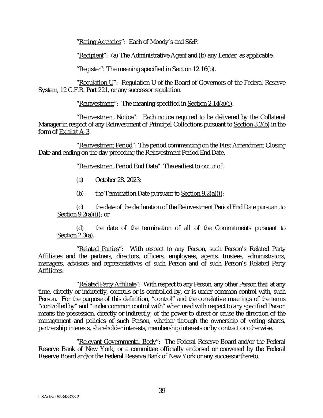“Rating Agencies”: Each of Moody’s and S&P. “Recipient”: (a) The Administrative Agent and (b) any Lender, as applicable. “Register”: The meaning specified in Section 12.16(b). “Regulation U”: Regulation U of the Board of Governors of the Federal Reserve System, 12 C.F.R. Part 221, or any successor regulation. “Reinvestment”: The meaning specified in Section 2.14(a)(i). “Reinvestment Notice”: Each notice required to be delivered by the Collateral Manager in respect of any Reinvestment of Principal Collections pursuant to Section 3.2(b) in the form of Exhibit A-3. “Reinvestment Period”: The period commencing on the First Amendment Closing Date and ending on the day preceding the Reinvestment Period End Date. “Reinvestment Period End Date”: The earliest to occur of: (a) October 28, 2023; (b) the Termination Date pursuant to Section 9.2(a)(i); (c) the date of the declaration of the Reinvestment Period End Date pursuant to Section 9.2(a)(ii); or (d) the date of the termination of all of the Commitments pursuant to Section 2.3(a). “Related Parties”: With respect to any Person, such Person’s Related Party Affiliates and the partners, directors, officers, employees, agents, trustees, administrators, managers, advisors and representatives of such Person and of such Person’s Related Party Affiliates. “Related Party Affiliate”: With respect to any Person, any other Person that, at any time, directly or indirectly, controls or is controlled by, or is under common control with, such Person. For the purpose of this definition, “control” and the correlative meanings of the terms “controlled by” and “under common control with” when used with respect to any specified Person means the possession, directly or indirectly, of the power to direct or cause the direction of the management and policies of such Person, whether through the ownership of voting shares, partnership interests, shareholder interests, membership interests or by contract or otherwise. “Relevant Governmental Body”: The Federal Reserve Board and/or the Federal Reserve Bank of New York, or a committee officially endorsed or convened by the Federal Reserve Board and/or the Federal Reserve Bank of New York or any successor thereto. -39- USActive 55348338.2