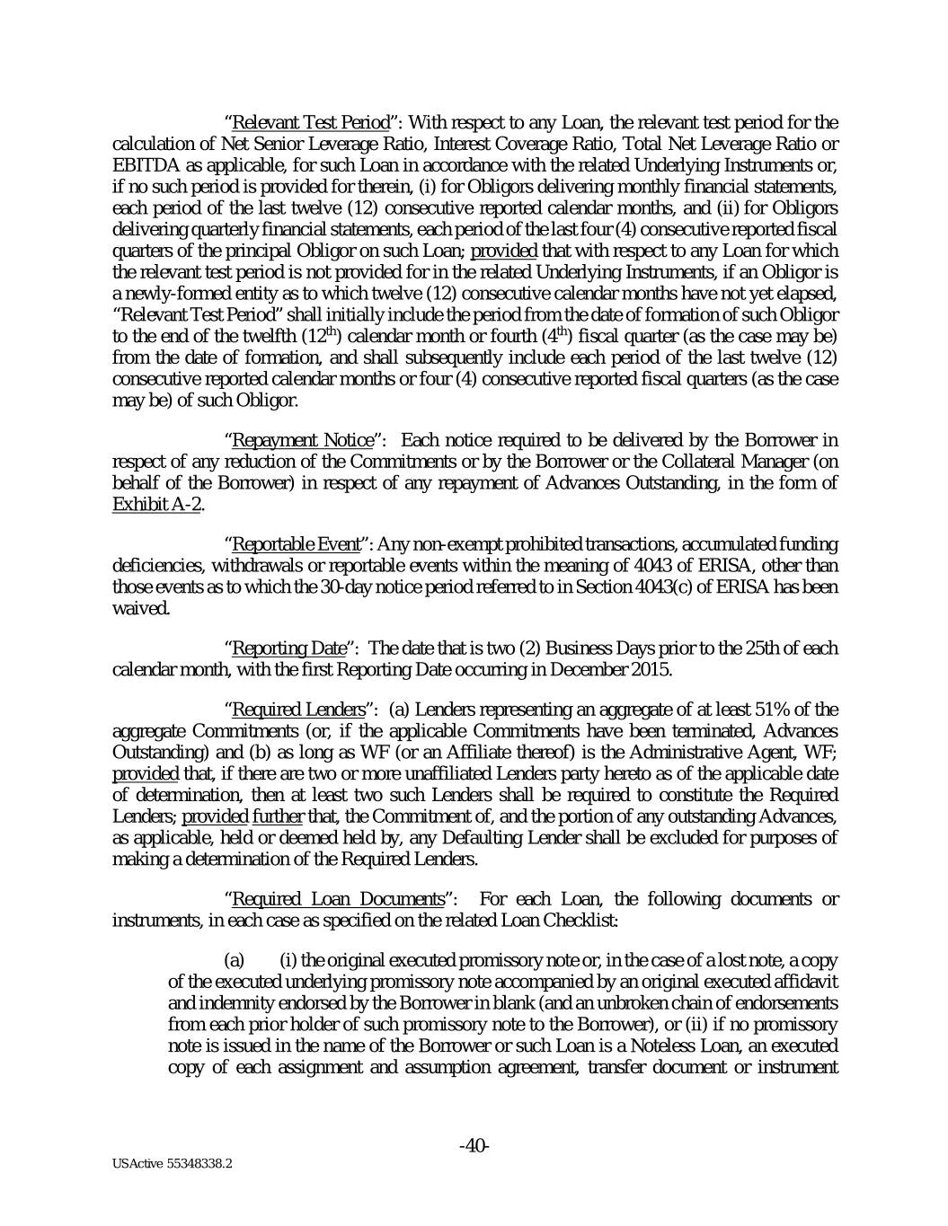 “Relevant Test Period”: With respect to any Loan, the relevant test period for the calculation of Net Senior Leverage Ratio, Interest Coverage Ratio, Total Net Leverage Ratio or EBITDA as applicable, for such Loan in accordance with the related Underlying Instruments or, if no such period is provided for therein, (i) for Obligors delivering monthly financial statements, each period of the last twelve (12) consecutive reported calendar months, and (ii) for Obligors delivering quarterly financial statements, each period of the last four (4) consecutive reported fiscal quarters of the principal Obligor on such Loan; provided that with respect to any Loan for which the relevant test period is not provided for in the related Underlying Instruments, if an Obligor is a newly-formed entity as to which twelve (12) consecutive calendar months have not yet elapsed, “Relevant Test Period” shall initially include the period from the date of formation of such Obligor to the end of the twelfth (12th) calendar month or fourth (4th) fiscal quarter (as the case may be) from the date of formation, and shall subsequently include each period of the last twelve (12) consecutive reported calendar months or four (4) consecutive reported fiscal quarters (as the case may be) of such Obligor. “Repayment Notice”: Each notice required to be delivered by the Borrower in respect of any reduction of the Commitments or by the Borrower or the Collateral Manager (on behalf of the Borrower) in respect of any repayment of Advances Outstanding, in the form of Exhibit A-2. “Reportable Event”: Any non-exempt prohibited transactions, accumulated funding deficiencies, withdrawals or reportable events within the meaning of 4043 of ERISA, other than those events as to which the 30-day notice period referred to in Section 4043(c) of ERISA has been waived. “Reporting Date”: The date that is two (2) Business Days prior to the 25th of each calendar month, with the first Reporting Date occurring in December 2015. “Required Lenders”: (a) Lenders representing an aggregate of at least 51% of the aggregate Commitments (or, if the applicable Commitments have been terminated, Advances Outstanding) and (b) as long as WF (or an Affiliate thereof) is the Administrative Agent, WF; provided that, if there are two or more unaffiliated Lenders party hereto as of the applicable date of determination, then at least two such Lenders shall be required to constitute the Required Lenders; provided further that, the Commitment of, and the portion of any outstanding Advances, as applicable, held or deemed held by, any Defaulting Lender shall be excluded for purposes of making a determination of the Required Lenders. “Required Loan Documents”: For each Loan, the following documents or instruments, in each case as specified on the related Loan Checklist: (a) (i) the original executed promissory note or, in the case of a lost note, a copy of the executed underlying promissory note accompanied by an original executed affidavit and indemnity endorsed by the Borrower in blank (and an unbroken chain of endorsements from each prior holder of such promissory note to the Borrower), or (ii) if no promissory note is issued in the name of the Borrower or such Loan is a Noteless Loan, an executed copy of each assignment and assumption agreement, transfer document or instrument -40- USActive 55348338.2