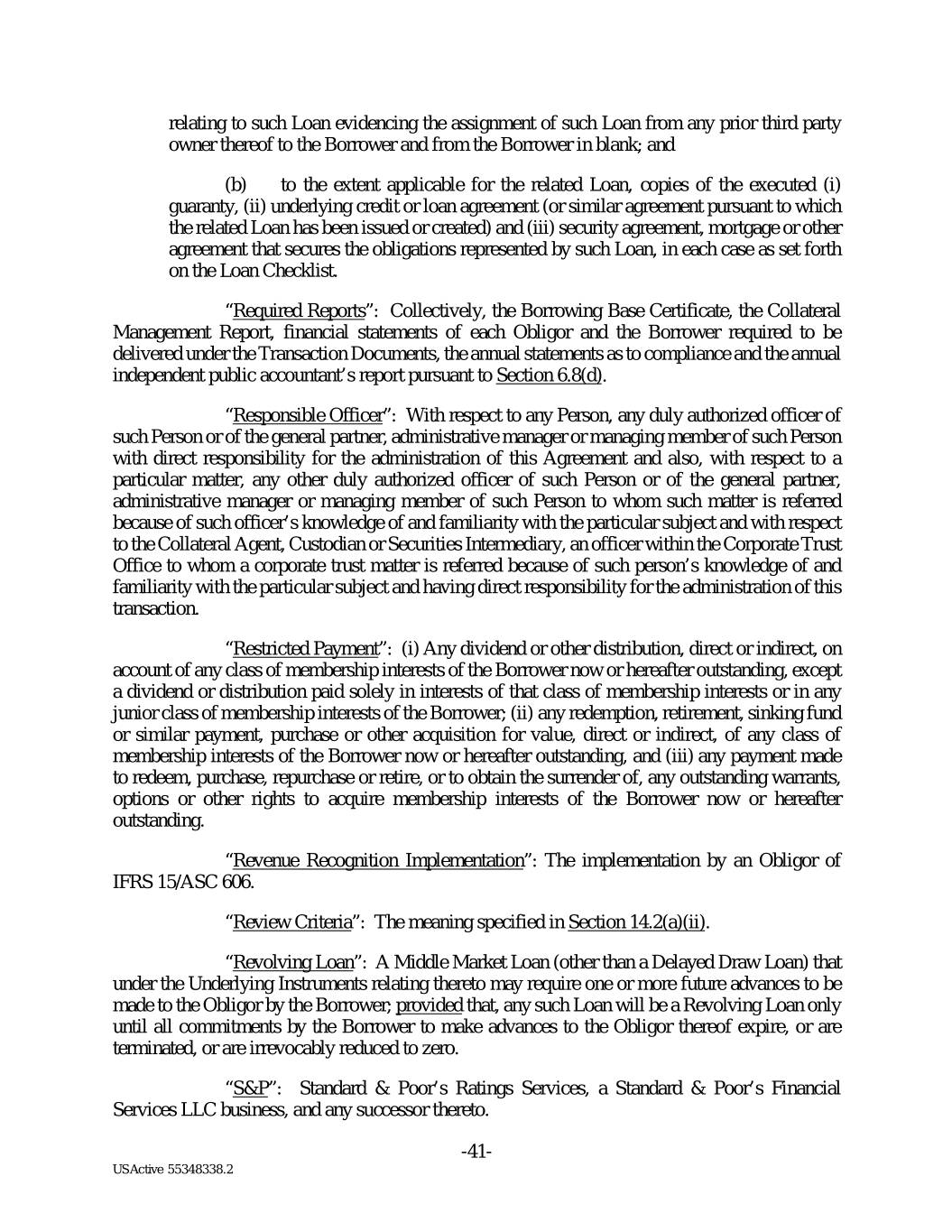 relating to such Loan evidencing the assignment of such Loan from any prior third party owner thereof to the Borrower and from the Borrower in blank; and (b) to the extent applicable for the related Loan, copies of the executed (i) guaranty, (ii) underlying credit or loan agreement (or similar agreement pursuant to which the related Loan has been issued or created) and (iii) security agreement, mortgage or other agreement that secures the obligations represented by such Loan, in each case as set forth on the Loan Checklist. “Required Reports”: Collectively, the Borrowing Base Certificate, the Collateral Management Report, financial statements of each Obligor and the Borrower required to be delivered under the Transaction Documents, the annual statements as to compliance and the annual independent public accountant’s report pursuant to Section 6.8(d). “Responsible Officer”: With respect to any Person, any duly authorized officer of such Person or of the general partner, administrative manager or managing member of such Person with direct responsibility for the administration of this Agreement and also, with respect to a particular matter, any other duly authorized officer of such Person or of the general partner, administrative manager or managing member of such Person to whom such matter is referred because of such officer’s knowledge of and familiarity with the particular subject and with respect to the Collateral Agent, Custodian or Securities Intermediary, an officer within the Corporate Trust Office to whom a corporate trust matter is referred because of such person’s knowledge of and familiarity with the particular subject and having direct responsibility for the administration of this transaction. “Restricted Payment”: (i) Any dividend or other distribution, direct or indirect, on account of any class of membership interests of the Borrower now or hereafter outstanding, except a dividend or distribution paid solely in interests of that class of membership interests or in any junior class of membership interests of the Borrower; (ii) any redemption, retirement, sinking fund or similar payment, purchase or other acquisition for value, direct or indirect, of any class of membership interests of the Borrower now or hereafter outstanding, and (iii) any payment made to redeem, purchase, repurchase or retire, or to obtain the surrender of, any outstanding warrants, options or other rights to acquire membership interests of the Borrower now or hereafter outstanding. “Revenue Recognition Implementation”: The implementation by an Obligor of IFRS 15/ASC 606. “Review Criteria”: The meaning specified in Section 14.2(a)(ii). “Revolving Loan”: A Middle Market Loan (other than a Delayed Draw Loan) that under the Underlying Instruments relating thereto may require one or more future advances to be made to the Obligor by the Borrower; provided that, any such Loan will be a Revolving Loan only until all commitments by the Borrower to make advances to the Obligor thereof expire, or are terminated, or are irrevocably reduced to zero. “S&P”: Standard & Poor’s Ratings Services, a Standard & Poor’s Financial Services LLC business, and any successor thereto. -41- USActive 55348338.2