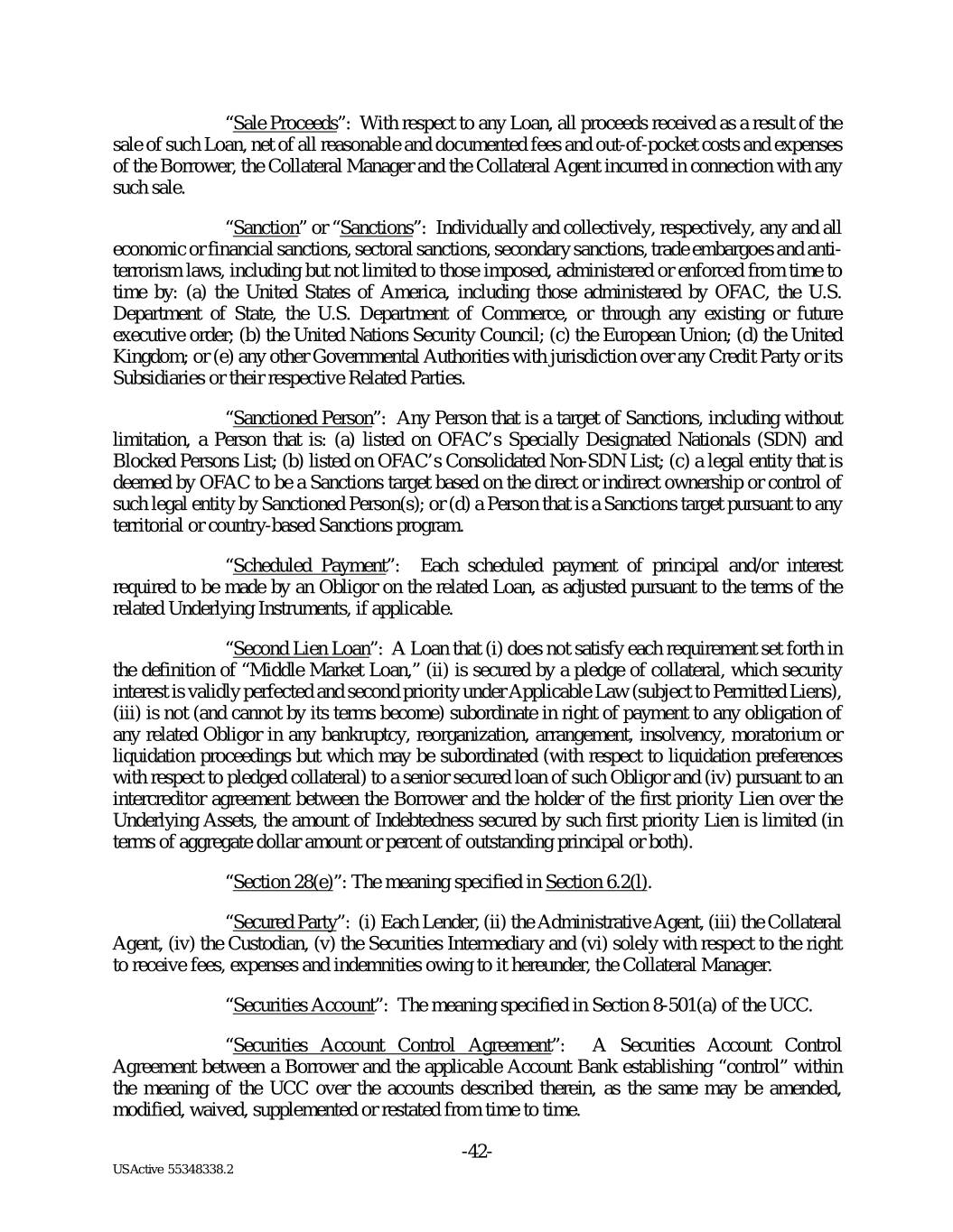 “Sale Proceeds”: With respect to any Loan, all proceeds received as a result of the sale of such Loan, net of all reasonable and documented fees and out-of-pocket costs and expenses of the Borrower, the Collateral Manager and the Collateral Agent incurred in connection with any such sale. “Sanction” or “Sanctions”: Individually and collectively, respectively, any and all economic or financial sanctions, sectoral sanctions, secondary sanctions, trade embargoes and anti- terrorism laws, including but not limited to those imposed, administered or enforced from time to time by: (a) the United States of America, including those administered by OFAC, the U.S. Department of State, the U.S. Department of Commerce, or through any existing or future executive order; (b) the United Nations Security Council; (c) the European Union; (d) the United Kingdom; or (e) any other Governmental Authorities with jurisdiction over any Credit Party or its Subsidiaries or their respective Related Parties. “Sanctioned Person”: Any Person that is a target of Sanctions, including without limitation, a Person that is: (a) listed on OFAC’s Specially Designated Nationals (SDN) and Blocked Persons List; (b) listed on OFAC’s Consolidated Non-SDN List; (c) a legal entity that is deemed by OFAC to be a Sanctions target based on the direct or indirect ownership or control of such legal entity by Sanctioned Person(s); or (d) a Person that is a Sanctions target pursuant to any territorial or country-based Sanctions program. “Scheduled Payment”: Each scheduled payment of principal and/or interest required to be made by an Obligor on the related Loan, as adjusted pursuant to the terms of the related Underlying Instruments, if applicable. “Second Lien Loan”: A Loan that (i) does not satisfy each requirement set forth in the definition of “Middle Market Loan,” (ii) is secured by a pledge of collateral, which security interest is validly perfected and second priority under Applicable Law (subject to Permitted Liens), (iii) is not (and cannot by its terms become) subordinate in right of payment to any obligation of any related Obligor in any bankruptcy, reorganization, arrangement, insolvency, moratorium or liquidation proceedings but which may be subordinated (with respect to liquidation preferences with respect to pledged collateral) to a senior secured loan of such Obligor and (iv) pursuant to an intercreditor agreement between the Borrower and the holder of the first priority Lien over the Underlying Assets, the amount of Indebtedness secured by such first priority Lien is limited (in terms of aggregate dollar amount or percent of outstanding principal or both). “Section 28(e)”: The meaning specified in Section 6.2(l). “Secured Party”: (i) Each Lender, (ii) the Administrative Agent, (iii) the Collateral Agent, (iv) the Custodian, (v) the Securities Intermediary and (vi) solely with respect to the right to receive fees, expenses and indemnities owing to it hereunder, the Collateral Manager. “Securities Account”: The meaning specified in Section 8-501(a) of the UCC. “Securities Account Control Agreement”: A Securities Account Control Agreement between a Borrower and the applicable Account Bank establishing “control” within the meaning of the UCC over the accounts described therein, as the same may be amended, modified, waived, supplemented or restated from time to time. -42- USActive 55348338.2