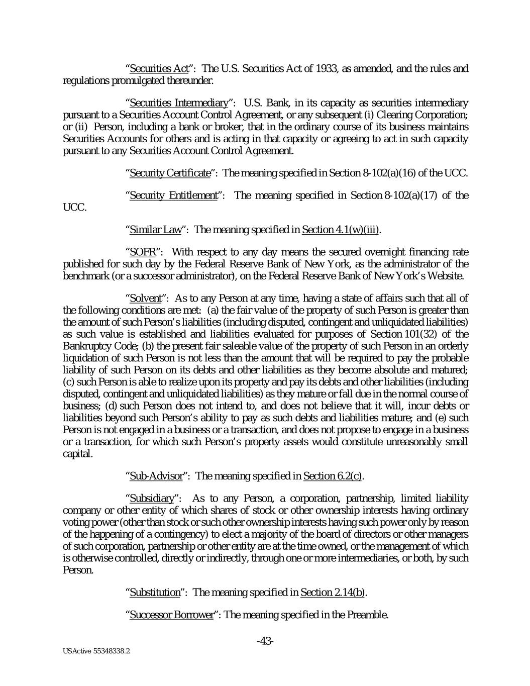 “Securities Act”: The U.S. Securities Act of 1933, as amended, and the rules and regulations promulgated thereunder. “Securities Intermediary”: U.S. Bank, in its capacity as securities intermediary pursuant to a Securities Account Control Agreement, or any subsequent (i) Clearing Corporation; or (ii) Person, including a bank or broker, that in the ordinary course of its business maintains Securities Accounts for others and is acting in that capacity or agreeing to act in such capacity pursuant to any Securities Account Control Agreement. “Security Certificate”: The meaning specified in Section 8-102(a)(16) of the UCC. “Security Entitlement”: The meaning specified in Section 8-102(a)(17) of the UCC. “Similar Law”: The meaning specified in Section 4.1(w)(iii). “SOFR”: With respect to any day means the secured overnight financing rate published for such day by the Federal Reserve Bank of New York, as the administrator of the benchmark (or a successor administrator), on the Federal Reserve Bank of New York’s Website. “Solvent”: As to any Person at any time, having a state of affairs such that all of the following conditions are met: (a) the fair value of the property of such Person is greater than the amount of such Person’s liabilities (including disputed, contingent and unliquidated liabilities) as such value is established and liabilities evaluated for purposes of Section 101(32) of the Bankruptcy Code; (b) the present fair saleable value of the property of such Person in an orderly liquidation of such Person is not less than the amount that will be required to pay the probable liability of such Person on its debts and other liabilities as they become absolute and matured; (c) such Person is able to realize upon its property and pay its debts and other liabilities (including disputed, contingent and unliquidated liabilities) as they mature or fall due in the normal course of business; (d) such Person does not intend to, and does not believe that it will, incur debts or liabilities beyond such Person’s ability to pay as such debts and liabilities mature; and (e) such Person is not engaged in a business or a transaction, and does not propose to engage in a business or a transaction, for which such Person’s property assets would constitute unreasonably small capital. “Sub-Advisor”: The meaning specified in Section 6.2(c). “Subsidiary”: As to any Person, a corporation, partnership, limited liability company or other entity of which shares of stock or other ownership interests having ordinary voting power (other than stock or such other ownership interests having such power only by reason of the happening of a contingency) to elect a majority of the board of directors or other managers of such corporation, partnership or other entity are at the time owned, or the management of which is otherwise controlled, directly or indirectly, through one or more intermediaries, or both, by such Person. “Substitution”: The meaning specified in Section 2.14(b). “Successor Borrower”: The meaning specified in the Preamble. -43- USActive 55348338.2