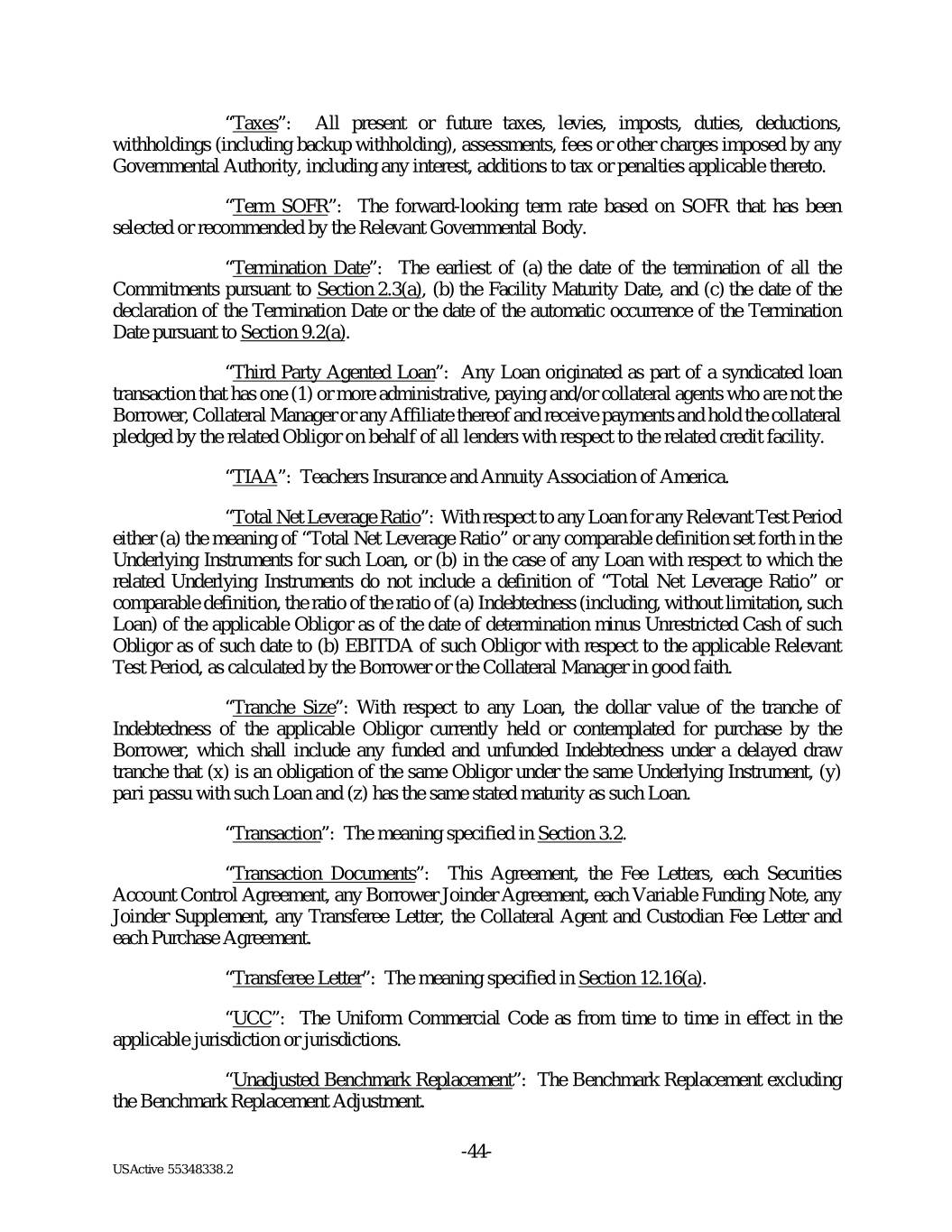 “Taxes”: All present or future taxes, levies, imposts, duties, deductions, withholdings (including backup withholding), assessments, fees or other charges imposed by any Governmental Authority, including any interest, additions to tax or penalties applicable thereto. “Term SOFR”: The forward-looking term rate based on SOFR that has been selected or recommended by the Relevant Governmental Body. “Termination Date”: The earliest of (a) the date of the termination of all the Commitments pursuant to Section 2.3(a), (b) the Facility Maturity Date, and (c) the date of the declaration of the Termination Date or the date of the automatic occurrence of the Termination Date pursuant to Section 9.2(a). “Third Party Agented Loan”: Any Loan originated as part of a syndicated loan transaction that has one (1) or more administrative, paying and/or collateral agents who are not the Borrower, Collateral Manager or any Affiliate thereof and receive payments and hold the collateral pledged by the related Obligor on behalf of all lenders with respect to the related credit facility. “TIAA”: Teachers Insurance and Annuity Association of America. “Total Net Leverage Ratio”: With respect to any Loan for any Relevant Test Period either (a) the meaning of “Total Net Leverage Ratio” or any comparable definition set forth in the Underlying Instruments for such Loan, or (b) in the case of any Loan with respect to which the related Underlying Instruments do not include a definition of “Total Net Leverage Ratio” or comparable definition, the ratio of the ratio of (a) Indebtedness (including, without limitation, such Loan) of the applicable Obligor as of the date of determination minus Unrestricted Cash of such Obligor as of such date to (b) EBITDA of such Obligor with respect to the applicable Relevant Test Period, as calculated by the Borrower or the Collateral Manager in good faith. “Tranche Size”: With respect to any Loan, the dollar value of the tranche of Indebtedness of the applicable Obligor currently held or contemplated for purchase by the Borrower, which shall include any funded and unfunded Indebtedness under a delayed draw tranche that (x) is an obligation of the same Obligor under the same Underlying Instrument, (y) pari passu with such Loan and (z) has the same stated maturity as such Loan. “Transaction”: The meaning specified in Section 3.2. “Transaction Documents”: This Agreement, the Fee Letters, each Securities Account Control Agreement, any Borrower Joinder Agreement, each Variable Funding Note, any Joinder Supplement, any Transferee Letter, the Collateral Agent and Custodian Fee Letter and each Purchase Agreement. “Transferee Letter”: The meaning specified in Section 12.16(a). “UCC”: The Uniform Commercial Code as from time to time in effect in the applicable jurisdiction or jurisdictions. “Unadjusted Benchmark Replacement”: The Benchmark Replacement excluding the Benchmark Replacement Adjustment. -44- USActive 55348338.2
